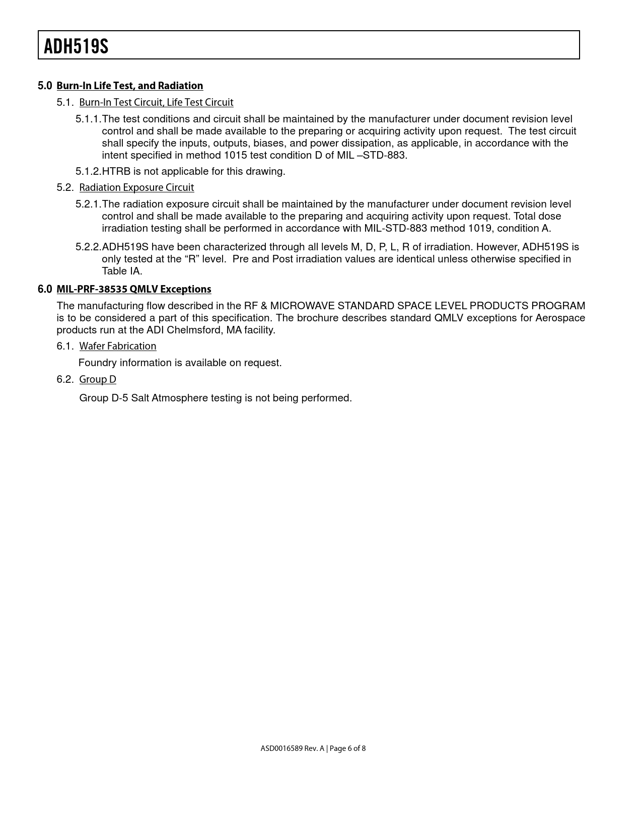 ADH519S5.0 Burn-In Life Test, and Radiation 5.1. Burn-In Test Circuit, Life Test Circuit 5.1.1. The test conditions and circuit shall be maintained by the manufacturer under document revision level control and shall be made available to the preparing or acquiring activity upon request. The test circuit shall specify the inputs, outputs, biases, and power dissipation, as applicable, in accordance with the intent specified in method 1015 test condition D of MIL –STD-883. 5.1.2. HTRB is not applicable for this drawing. 5.2. Radiation Exposure Circuit 5.2.1. The radiation exposure circuit shall be maintained by the manufacturer under document revision level control and shall be made available to the preparing and acquiring activity upon request. Total dose irradiation testing shall be performed in accordance with MIL-STD-883 method 1019, condition A. 5.2.2. ADH519S have been characterized through all levels M, D, P, L, R of irradiation. However, ADH519S is only tested at the “R” level. Pre and Post irradiation values are identical unless otherwise specified in Table IA. 6.0 MIL-PRF-38535 QMLV Exceptions The manufacturing flow described in the RF & MICROWAVE STANDARD SPACE LEVEL PRODUCTS PROGRAM is to be considered a part of this specification. The brochure describes standard QMLV exceptions for Aerospace products run at the ADI Chelmsford, MA facility. 6.1. Wafer Fabrication Foundry information is available on request. 6.2. Group D Group D-5 Salt Atmosphere testing is not being performed. ASD0016589 Rev. A | Page 6 of 8