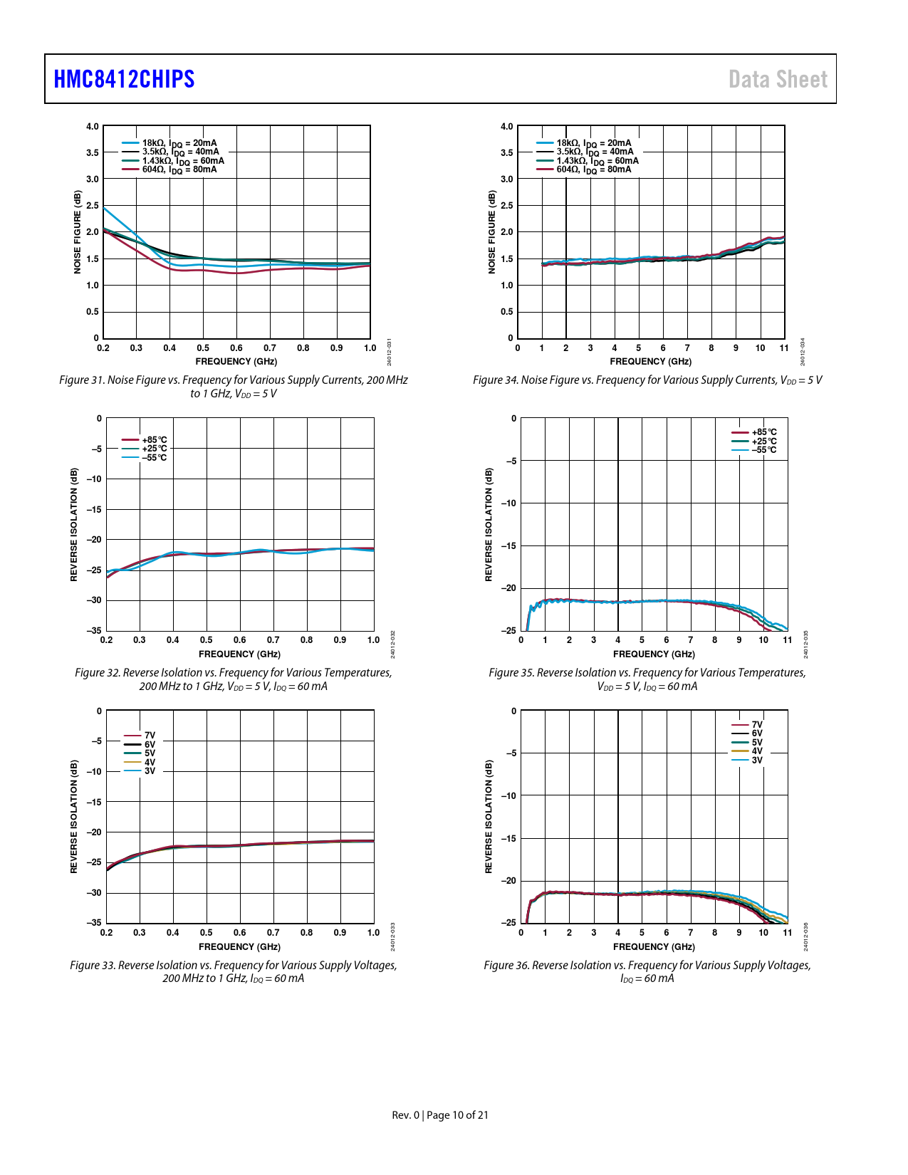 HMC8412CHIPSData Sheet4.04.018kΩ, IDQ = 20mA18kΩ, IDQ = 20mA3.53.5kΩ, IDQ = 40mA3.53.5kΩ, I1.43kΩ, IDQ = 40mADQ = 60mA1.43kΩ, I604Ω, IDQ = 60mADQ = 80mA604Ω, IDQ = 80mA3.03.0))dBdB( 2.5( 2.5EERR2.02.0FIGUFIGUEE1.51.5OISOISNN1.01.00.50.5000.20.30.40.50.60.70.80.91.0 031 01234567891011 034 FREQUENCY (GHz) 24012- FREQUENCY (GHz) 24012- Figure 31. Noise Figure vs. Frequency for Various Supply Currents, 200 MHz Figure 34. Noise Figure vs. Frequency for Various Supply Currents, VDD = 5 V to 1 GHz, VDD = 5 V 00+85°C+85°C+25°C–5+25°C–55°C–55°C–5))BB–10(d(dNNIOIOT–10–15TAALLSOSO–20SE I–15SE I–25EVEREVERRR–20–30–35–250.20.30.40.50.60.70.80.91.0 032 01234567891011 035 FREQUENCY (GHz) 24012- FREQUENCY (GHz) 24012- Figure 32. Reverse Isolation vs. Frequency for Various Temperatures, Figure 35. Reverse Isolation vs. Frequency for Various Temperatures, 200 MHz to 1 GHz, VDD = 5 V, IDQ = 60 mA VDD = 5 V, IDQ = 60 mA 007V7V6V–56V5V5V–54V))3VB4VB–103V(d(dNNIOIOT–10–15TAALLSOSO–20SE I–15SE I–25EVEREVERRR–20–30–35–250.20.30.40.50.60.70.80.91.0 033 01234567891011 036 FREQUENCY (GHz) 24012- FREQUENCY (GHz) 24012- Figure 33. Reverse Isolation vs. Frequency for Various Supply Voltages, Figure 36. Reverse Isolation vs. Frequency for Various Supply Voltages, 200 MHz to 1 GHz, IDQ = 60 mA IDQ = 60 mA Rev. 0 | Page 10 of 21 Document Outline Features Applications Functional Block Diagram General Description Revision History Specifications 0.4 GHz to 8 GHz Frequency Range 8 GHz to 10 GHz Frequency Range Absolute Maximum Ratings Thermal Resistance Electrostatic Discharge (ESD) Ratings ESD Ratings for HMC8412CHIPS ESD Caution Pin Configuration and Function Descriptions Interface Schematics Typical Performance Characteristics Small Signal Response Large Signal Response Theory of Operation Applications Information Typical Application Circuit Recommended Bias Sequencing During Power-Up During Power-Down Assembly Diagram Mounting and Bonding Techniques for Millimeter Wave GaAs MMICs Handling Precautions Outline Dimensions Ordering Guide
