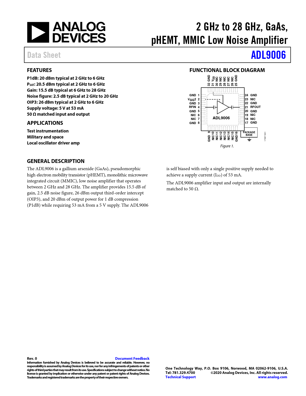 2 GHz to 28 GHz, GaAs,. pHEMT, MMIC Low Noise Amplifier. Data Sheet. ADL9006. FEATURES. FUNCTIONAL BLOCK DIAGRAM