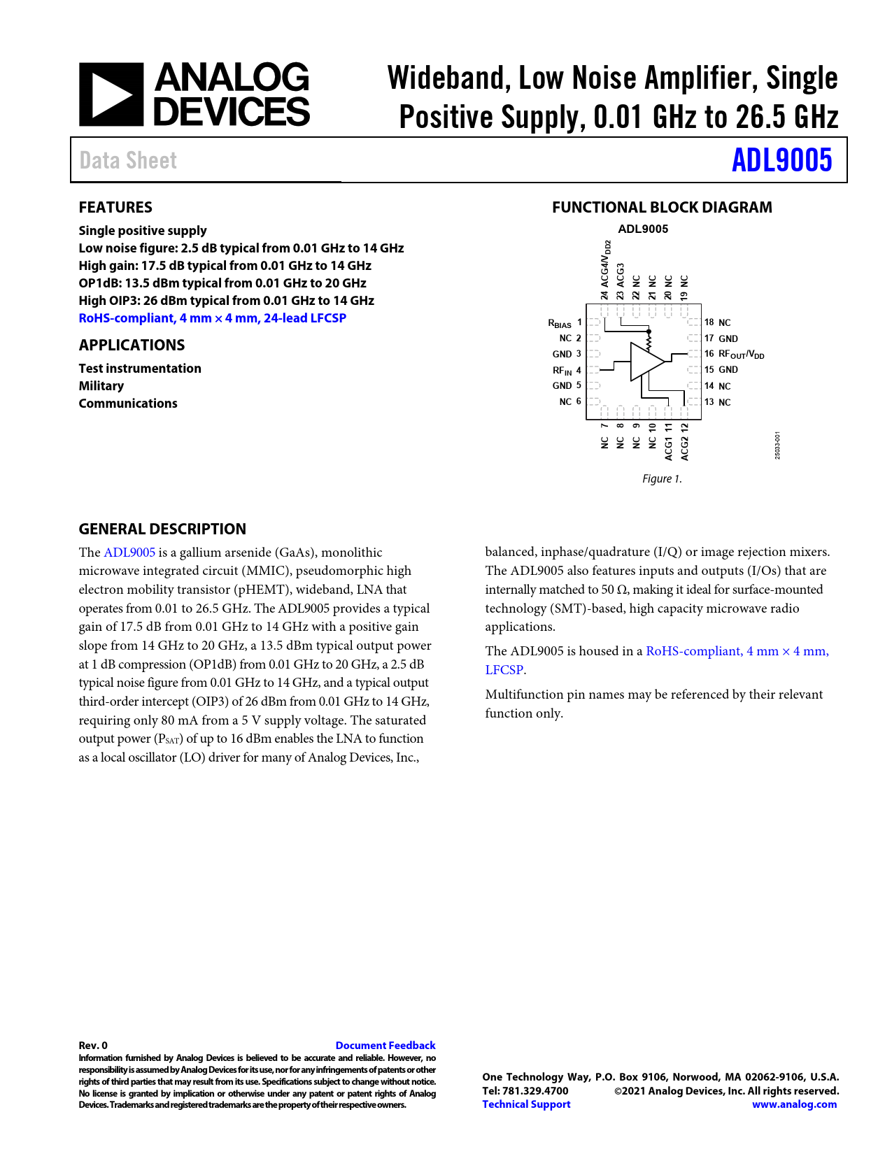 Wideband, Low Noise Amplifier, Single. Positive Supply, 0.01 GHz to 26.5 GHz. Data Sheet. ADL9005. FEATURES