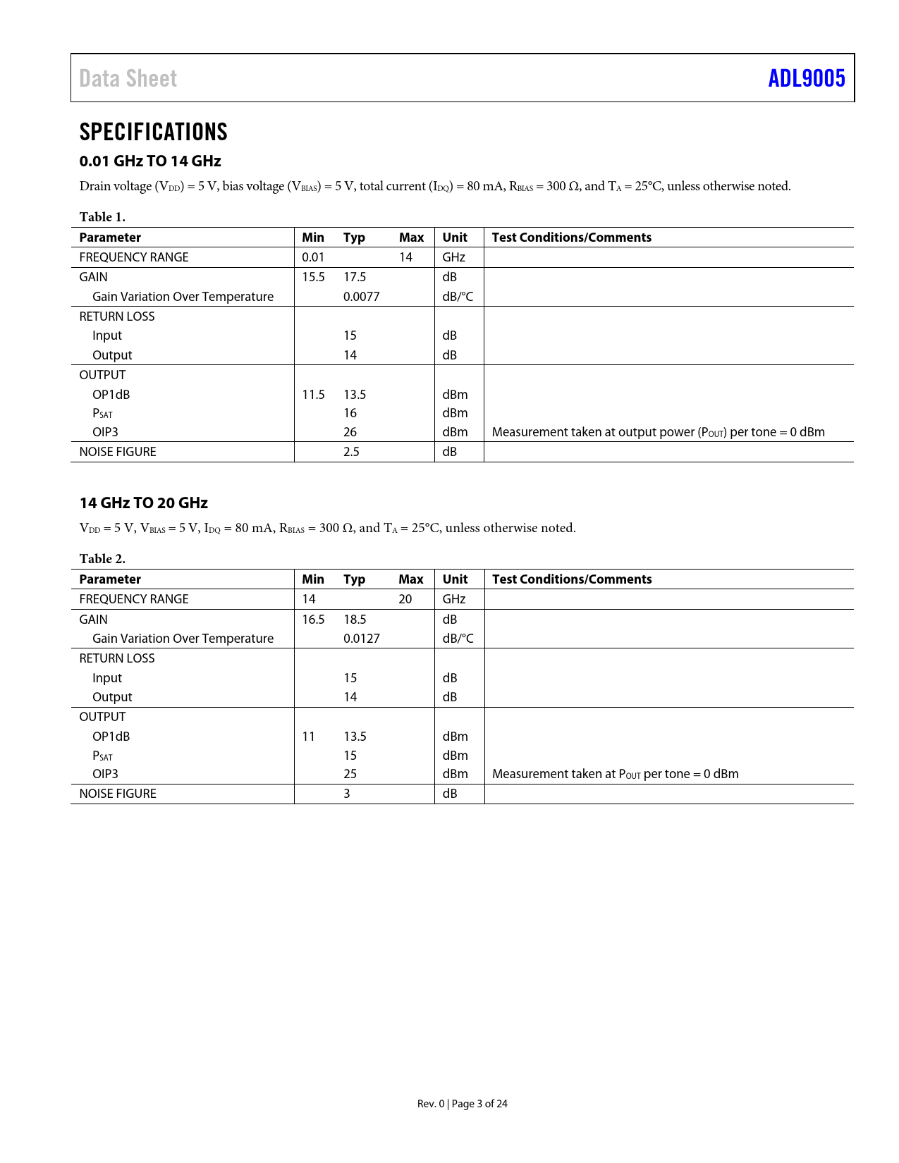 Páginas / Página24 / 3 — Data Sheet. ADL9005. SPECIFICATIONS 0.01 GHz TO 14 GHz. Table 1. …
