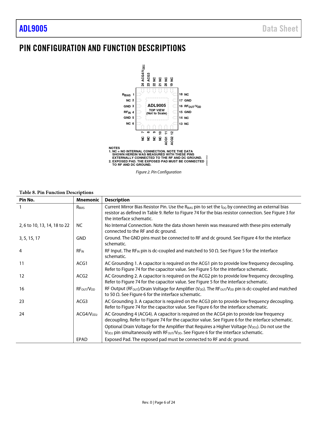 Páginas / Página24 / 6 — ADL9005. Data Sheet. PIN CONFIGURATION AND FUNCTION DESCRIPTIONS. DD2V4/ …