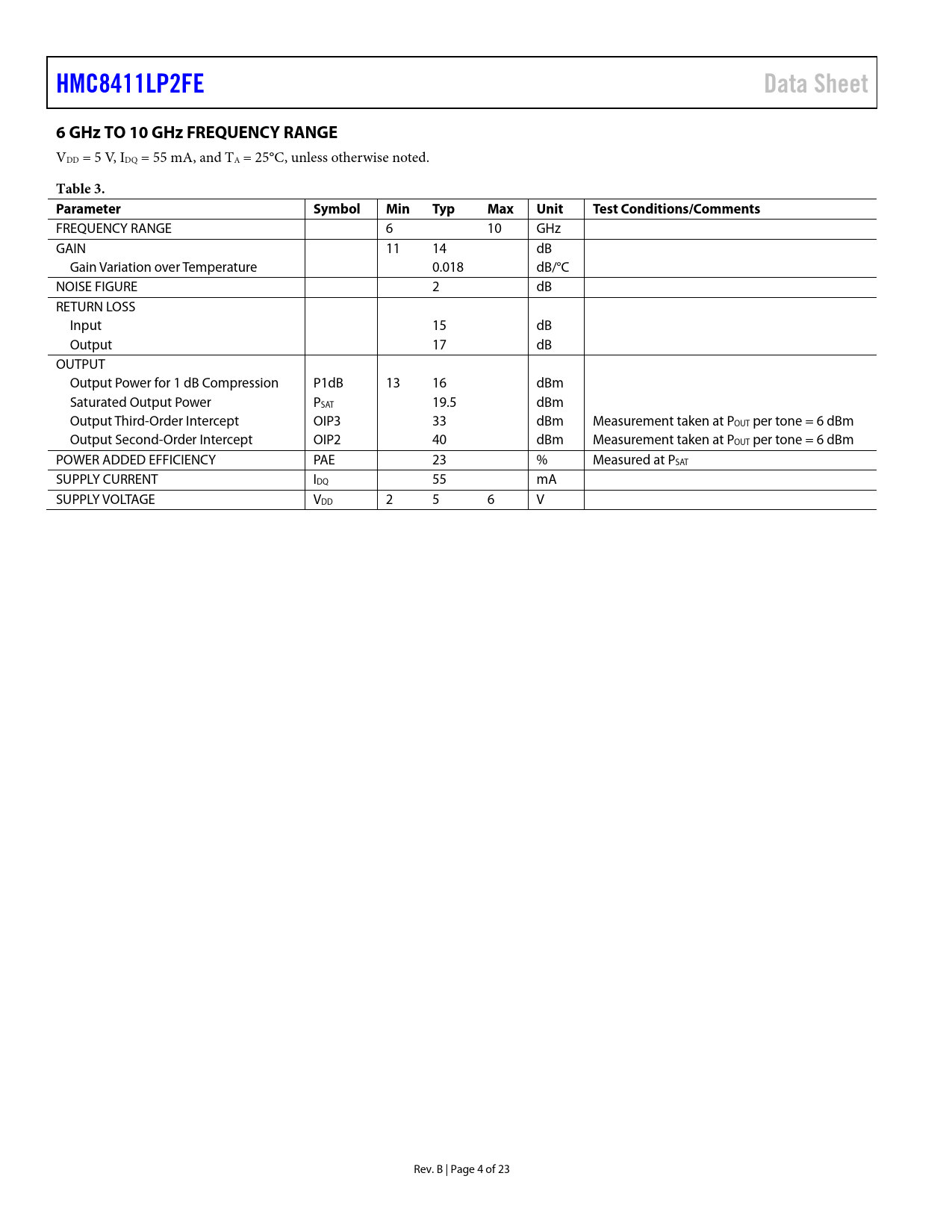 HMC8411LP2FE. Data Sheet. 6 GHz TO 10 GHz FREQUENCY RANGE. Table 3. Parameter. Symbol. Min. Typ. Max. Unit. Test Conditions/Comments