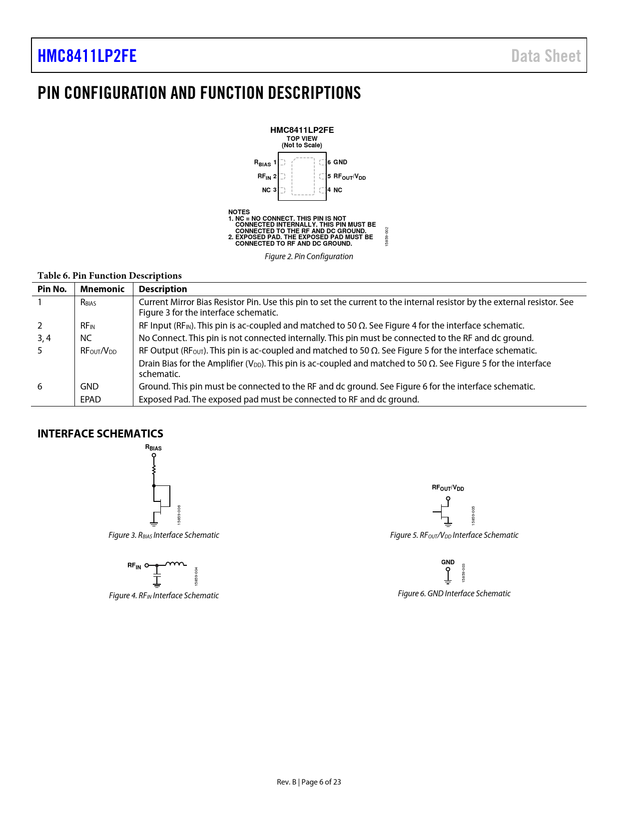 1 RBIAS Current Mirror Bias Resistor Pin. Use this pin to set the current to the internal resistor by the external resistor. See Figure 3 for the interface schematic. 2 RFIN RF Input (RFIN). This pin is ac-coupled and matched to 50 Ω. See Figure 4 for the interface schematic. 3, 4 NC No Connect. This pin is not connected internally. This pin must be connected to the RF and dc ground. 5 RFOUT/VDD RF Output (RFOUT). This pin is ac-coupled and matched to 50 Ω. See Figure 5 for the interface schematic. Drain Bias for the Amplifier (VDD). This pin is ac-coupled and matched to 50 Ω. See Figure 5 for the interface schematic. 6 GND Ground. This pin must be connected to the RF and dc ground. See Figure 6 for the interface schematic. EPAD Exposed Pad. The exposed pad must be connected to RF and dc ground.