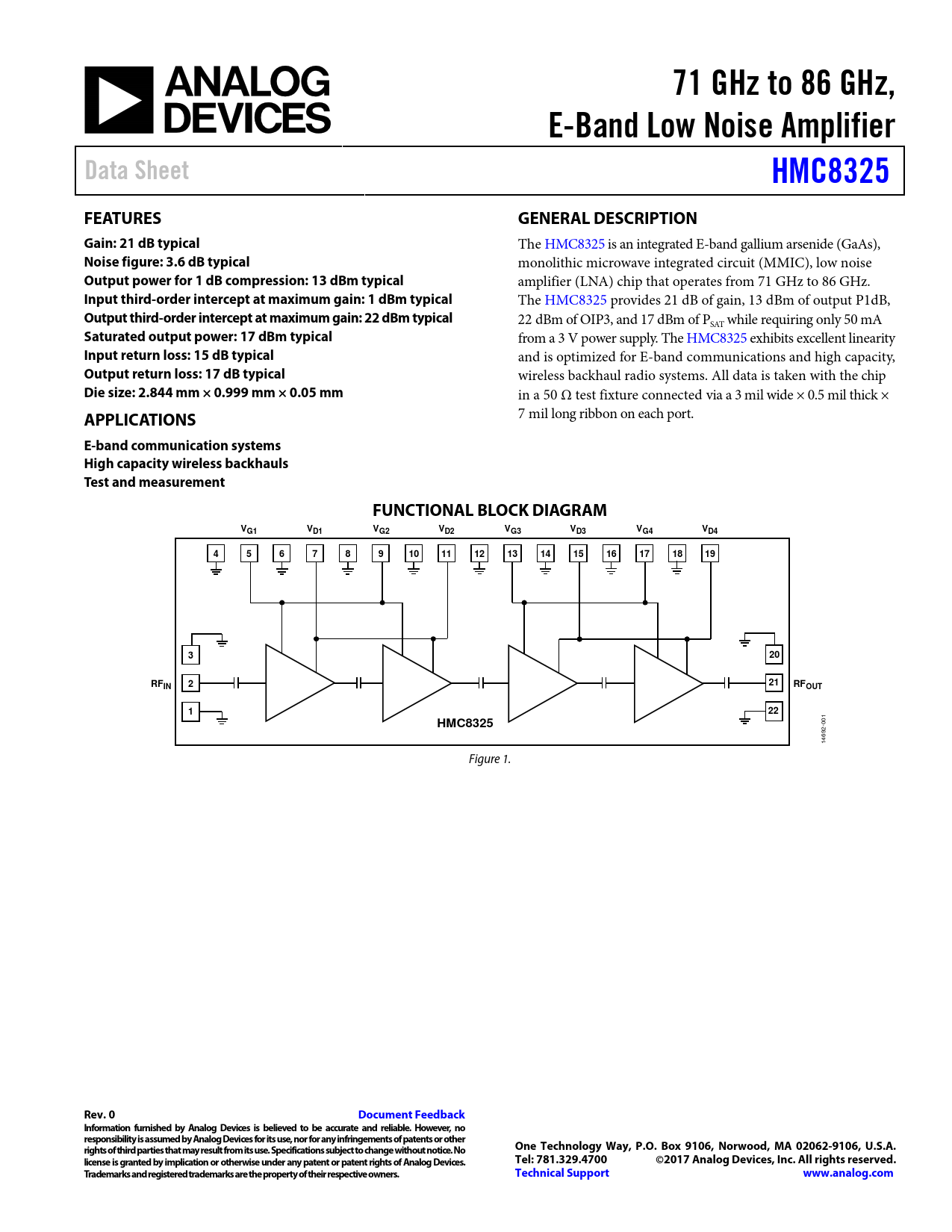 71 GHz to 86 GHz,. E-Band Low Noise Amplifier. Data Sheet. HMC8325. FEATURES. GENERAL DESCRIPTION. Gain: 21 dB typical
