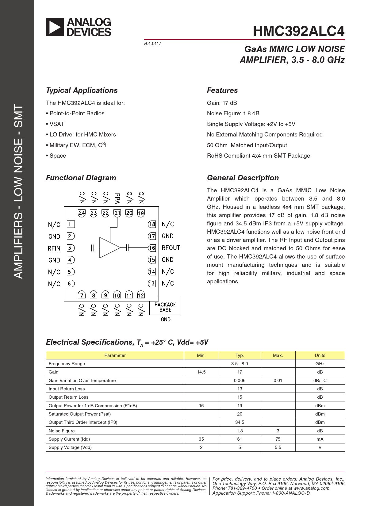 HMC392ALC4. GaAs MMIC LOW NOISE. AMPLIFIER, 3.5 - 8.0 GHz. Typical Applications. Features. Functional Diagram. General Description