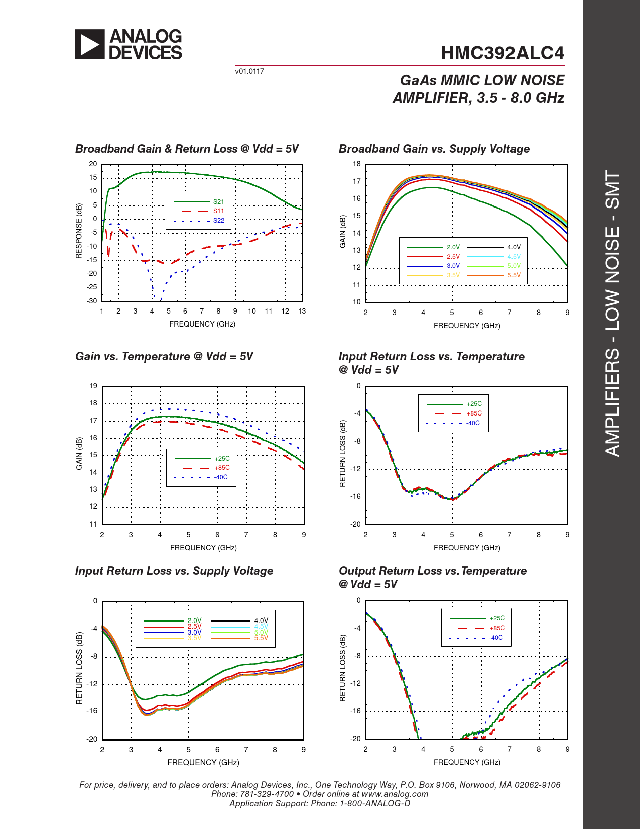HMC392ALC4. GaAs MMIC LOW NOISE. AMPLIFIER, 3.5 - 8.0 GHz. Broadband Gain & Return Loss @ Vdd = 5V