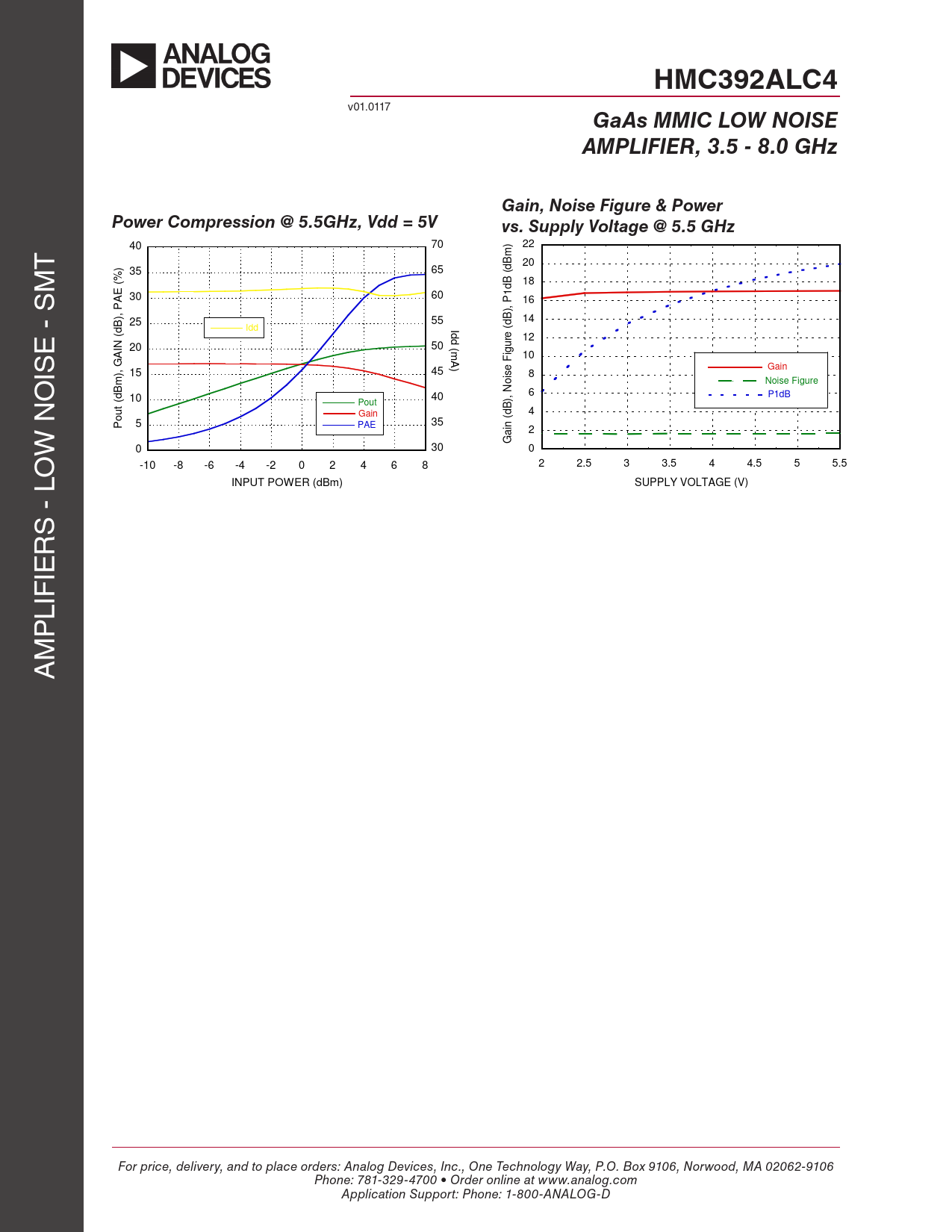 HMC392ALC4. GaAs MMIC LOW NOISE. AMPLIFIER, 3.5 - 8.0 GHz. Gain, Noise Figure & Power. Power Compression @ 5.5GHz, Vdd = 5V