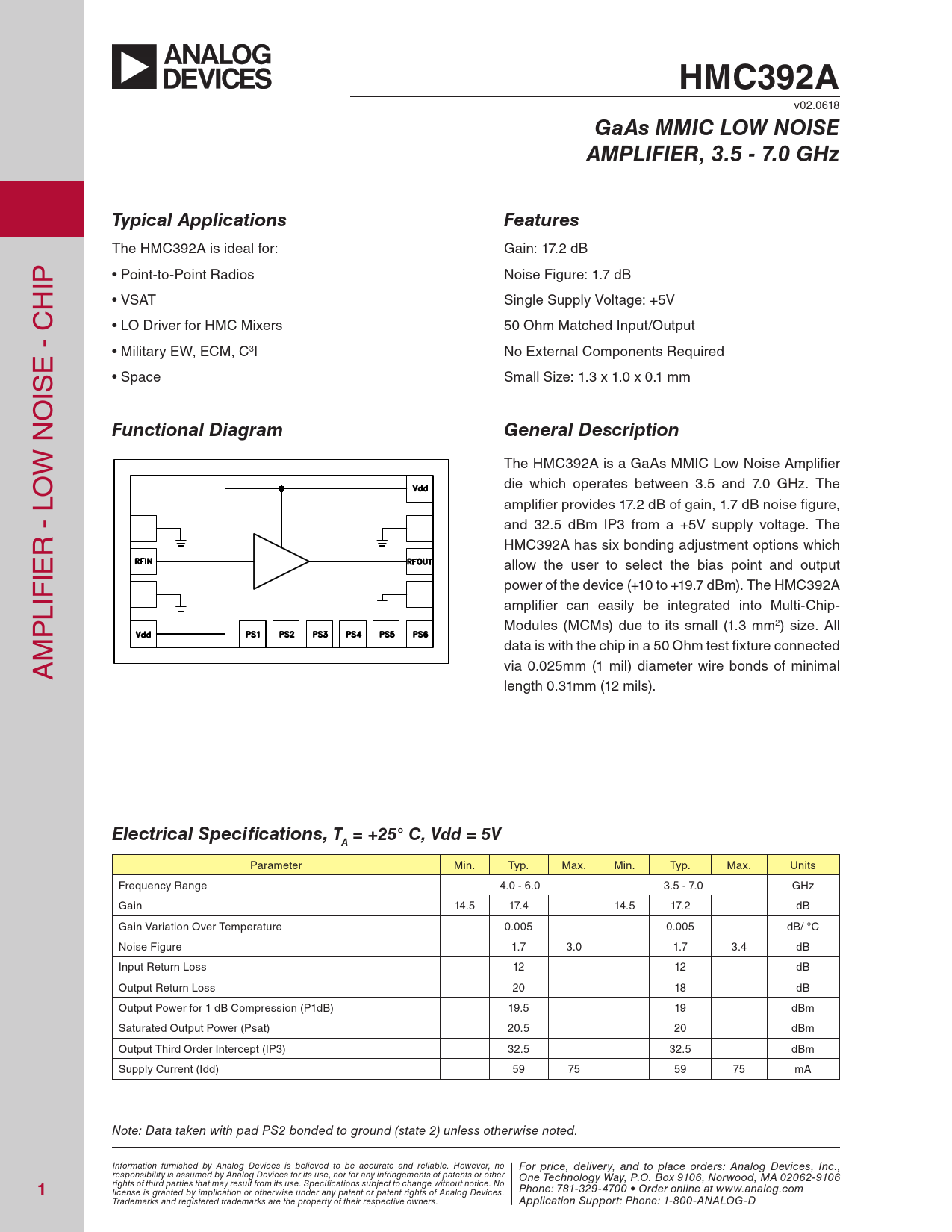 HMC392A. GaAs MMIC LOW NOISE. AMPLIFIER, 3.5 - 7.0 GHz. Typical Applications. Features. Functional Diagram. General Description