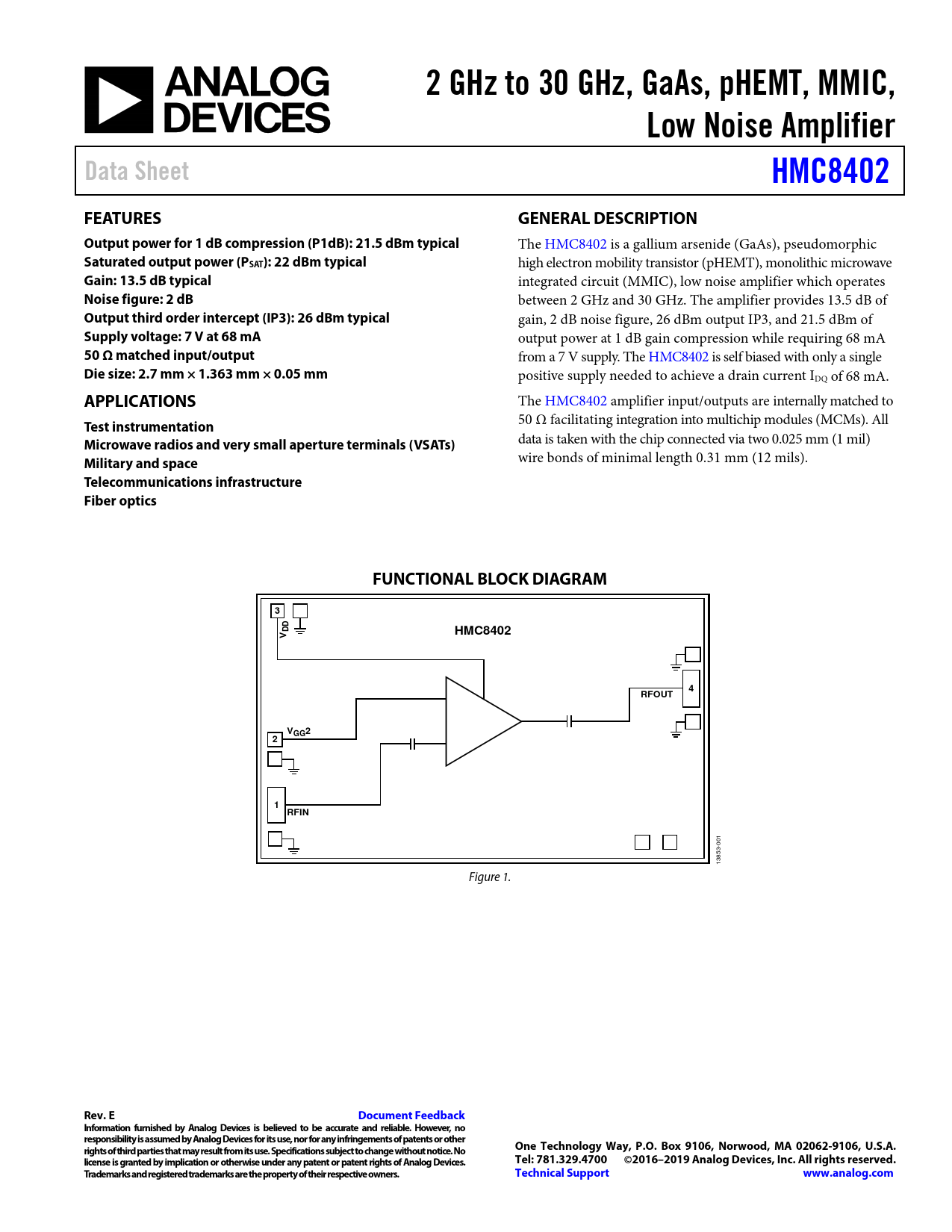 Telecommunications infrastructure Fiber optics FUNCTIONAL BLOCK DIAGRAM 3 DD HMC8402 V 4 RFOUT VGG2 2 1 RFIN
