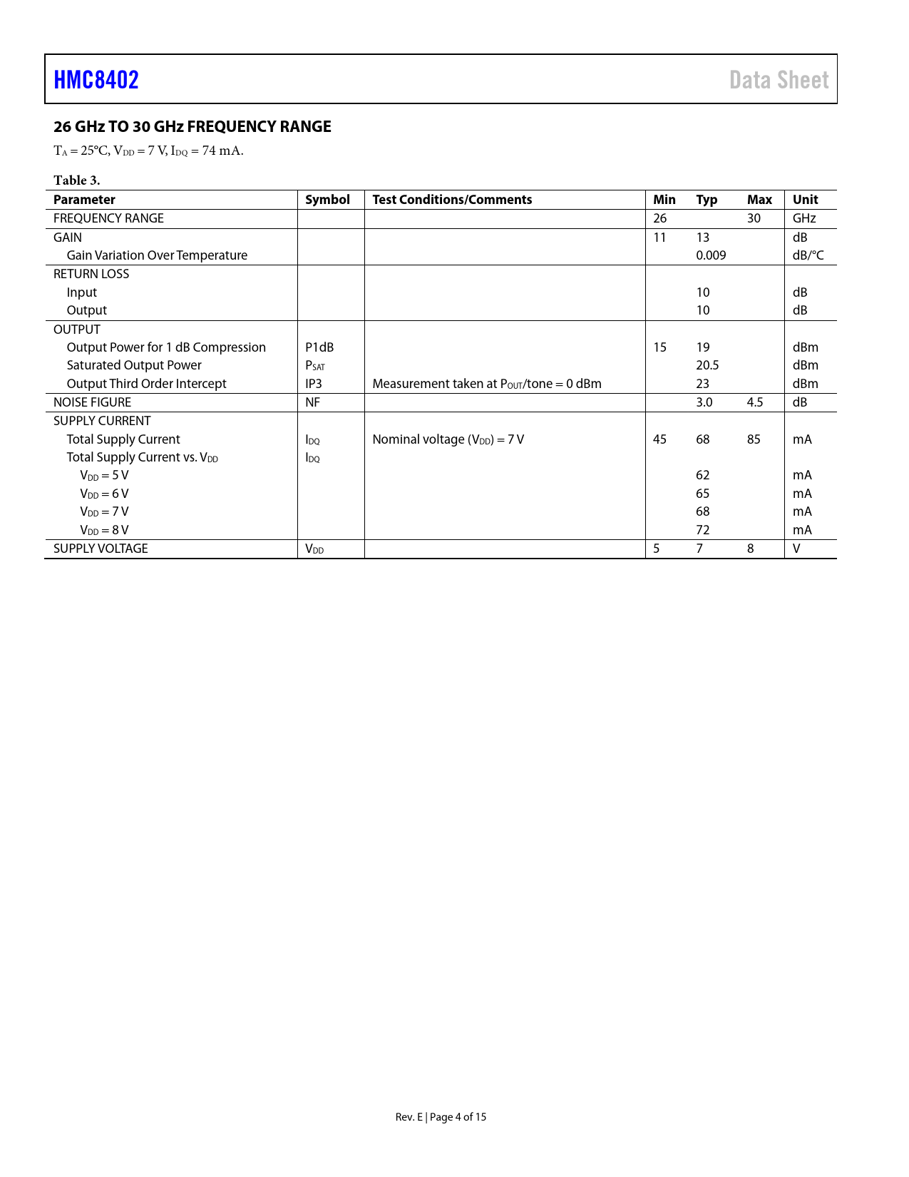 HMC8402. Data Sheet. 26 GHz TO 30 GHz FREQUENCY RANGE. Table 3. Parameter. Symbol. Test Conditions/Comments. Min. Typ. Max. Unit