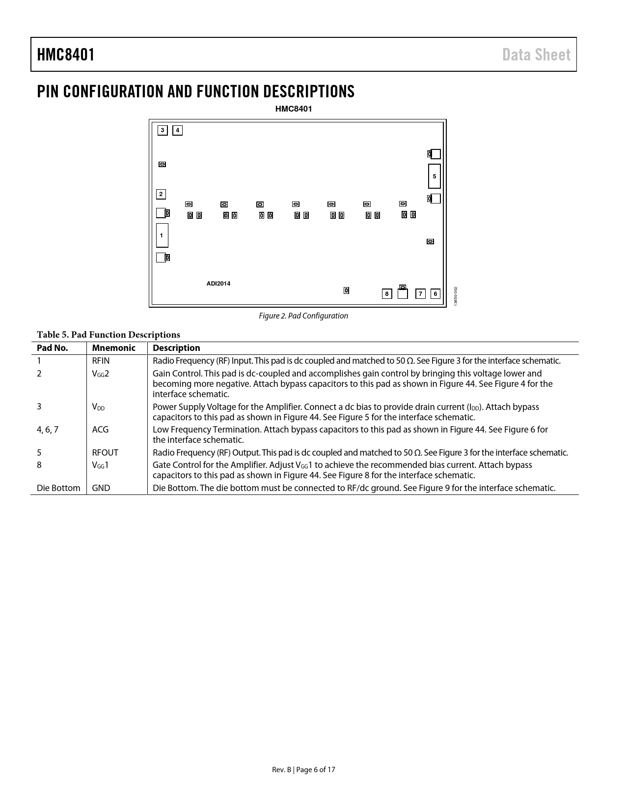 link to page 7 link to page 16 link to page 7 link to page 16 link to page 7 link to page 16 link to page 7 link to page 7 link to page 16 link to page 7 link to page 7 HMC8401Data SheetPIN CONFIGURATION AND FUNCTION DESCRIPTIONSHMC840134521ADI2014876 002 13850- Figure 2. Pad Configuration Table 5. Pad Function Descriptions Pad No.MnemonicDescription 1 RFIN Radio Frequency (RF) Input. This pad is dc coupled and matched to 50 Ω. See Figure 3 for the interface schematic. 2 VGG2 Gain Control. This pad is dc-coupled and accomplishes gain control by bringing this voltage lower and becoming more negative. Attach bypass capacitors to this pad as shown in Figure 44. See Figure 4 for the interface schematic. 3 VDD Power Supply Voltage for the Amplifier. Connect a dc bias to provide drain current (IDD). Attach bypass capacitors to this pad as shown in Figure 44. See Figure 5 for the interface schematic. 4, 6, 7 ACG Low Frequency Termination. Attach bypass capacitors to this pad as shown in Figure 44. See Figure 6 for the interface schematic. 5 RFOUT Radio Frequency (RF) Output. This pad is dc coupled and matched to 50 Ω. See Figure 3 for the interface schematic. 8 VGG1 Gate Control for the Amplifier. Adjust VGG1 to achieve the recommended bias current. Attach bypass capacitors to this pad as shown in Figure 44. See Figure 8 for the interface schematic. Die Bottom GND Die Bottom. The die bottom must be connected to RF/dc ground. See Figure 9 for the interface schematic. Rev. B | Page 6 of 17 Document Outline Features Applications General Description Functional Block Diagram Table of Contents Revision History Specifications 0.01 GHz to 3 GHz Frequency Range 3 GHz to 26 GHz Frequency Range 26 GHz to 28 GHz Frequency Range Absolute Maximum Ratings ESD Caution Pin Configuration and Function Descriptions Interface Schematics Typical Performance Characteristics Theory of Operation Applications Information Biasing Procedures Mounting and Bonding Techniques for Millimeterwave GaAs MMICs Handling Precautions Mounting Eutectic Die Attach Epoxy Die Attach Wire Bonding Typical Application Circuit Assembly Diagram Outline Dimensions Ordering Guide