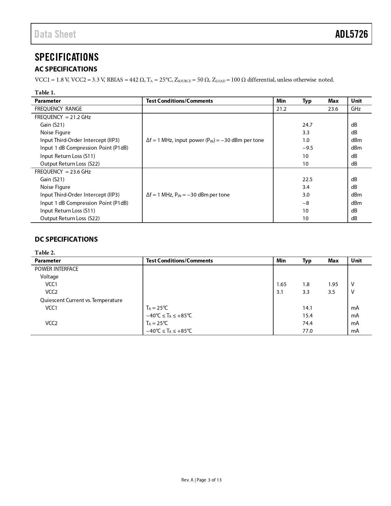 Data Sheet. ADL5726. SPECIFICATIONS AC SPECIFICATIONS. Table 1. Parameter. Test Conditions/Comments. Min. Typ. Max. Unit