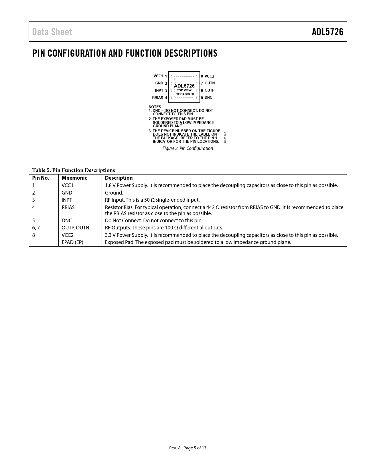 Data Sheet ADL5726 PIN CONFIGURATION AND FUNCTION DESCRIPTIONS VCC1 1 8 VCC2 GND 2 7 OUTN ADL5726 INPT 3 TOP VIEW 6 OUTP (Not to Scale) RBIAS 4 5 DNC NOTES 1. DNC = DO NOT CONNECT. DO NOT CONNECT TO THIS PIN. 2. THE EXPOSED PAD MUST BE SOLDERED TO A LOW IMPEDANCE GROUND PLANE. 3. THE DEVICE NUMBER ON THE FIGURE