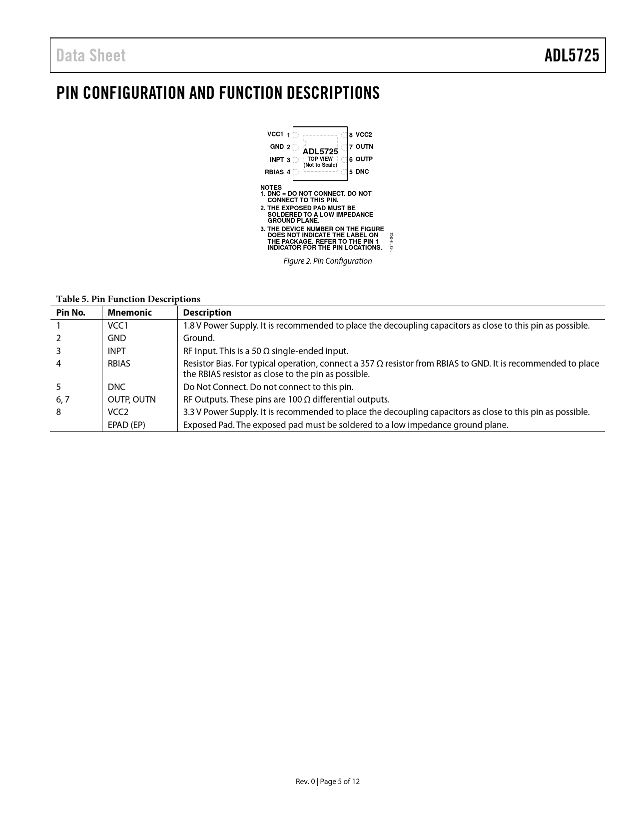 Data SheetADL5725PIN CONFIGURATION AND FUNCTION DESCRIPTIONSVCC1 18 VCC2GND 27 OUTNADL5725INPT 3TOP VIEW6 OUTP(Not to Scale)RBIAS 45 DNCNOTES 1. DNC = DO NOT CONNECT. DO NOT CONNECT TO THIS PIN. 2. THE EXPOSED PAD MUST BE SOLDERED TO A LOW IMPEDANCE GROUND PLANE. 3. THE DEVICE NUMBER ON THE FIGURE DOES NOT INDICATE THE LABEL ON 002 THE PACKAGE. REFER TO THE PIN 1 INDICATOR FOR THE PIN LOCATIONS. 14318- Figure 2. Pin Configuration Table 5. Pin Function Descriptions Pin No.MnemonicDescription 1 VCC1 1.8 V Power Supply. It is recommended to place the decoupling capacitors as close to this pin as possible. 2 GND Ground. 3 INPT RF Input. This is a 50 Ω single-ended input. 4 RBIAS Resistor Bias. For typical operation, connect a 357 Ω resistor from RBIAS to GND. It is recommended to place the RBIAS resistor as close to the pin as possible. 5 DNC Do Not Connect. Do not connect to this pin. 6, 7 OUTP, OUTN RF Outputs. These pins are 100 Ω differential outputs. 8 VCC2 3.3 V Power Supply. It is recommended to place the decoupling capacitors as close to this pin as possible. EPAD (EP) Exposed Pad. The exposed pad must be soldered to a low impedance ground plane. Rev. 0 | Page 5 of 12 Document Outline FEATURES APPLICATIONS FUNCTIONAL BLOCK DIAGRAM GENERAL DESCRIPTION TABLE OF CONTENTS REVISION HISTORY SPECIFICATIONS AC SPECIFICATIONS DC SPECIFICATIONS ABSOLUTE MAXIMUM RATINGS THERMAL RESISTANCE ESD CAUTION PIN CONFIGURATION AND FUNCTION DESCRIPTIONS TYPICAL PERFORMANCE CHARACTERISTICS THEORY OF OPERATION APPLICATIONS INFORMATION LAYOUT DIFFERENTIAL vs. SINGLE-ENDED OUTPUT EVALUATION BOARD INITIAL SETUP RESULTS BASIC CONNECTIONS FOR OPERATION OUTLINE DIMENSIONS ORDERING GUIDE