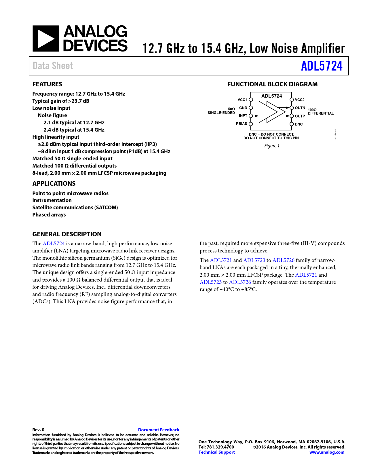 12.7 GHz to 15.4 GHz, Low Noise Amplifier. Data Sheet. ADL5724. FEATURES. FUNCTIONAL BLOCK DIAGRAM