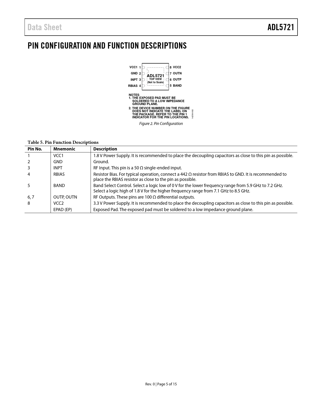 Data SheetADL5721PIN CONFIGURATION AND FUNCTION DESCRIPTIONSVCC1 18 VCC2GND 27 OUTNADL5721INPT 3TOP VIEW6 OUTP(Not to Scale)RBIAS 45 BANDNOTES 1. THE EXPOSED PAD MUST BE SOLDERED TO A LOW IMPEDANCE GROUND PLANE. 2. THE DEVICE NUMBER ON THE FIGURE DOES NOT INDICATE THE LABEL ON 002 THE PACKAGE. REFER TO THE PIN 1 INDICATOR FOR THE PIN LOCATIONS. 14258- Figure 2. Pin Configuration Table 5. Pin Function Descriptions Pin No.MnemonicDescription 1 VCC1 1.8 V Power Supply. It is recommended to place the decoupling capacitors as close to this pin as possible. 2 GND Ground. 3 INPT RF Input. This pin is a 50 Ω single-ended input. 4 RBIAS Resistor Bias. For typical operation, connect a 442 Ω resistor from RBIAS to GND. It is recommended to place the RBIAS resistor as close to the pin as possible. 5 BAND Band Select Control. Select a logic low of 0 V for the lower frequency range from 5.9 GHz to 7.2 GHz. Select a logic high of 1.8 V for the higher frequency range from 7.1 GHz to 8.5 GHz. 6, 7 OUTP, OUTN RF Outputs. These pins are 100 Ω differential outputs. 8 VCC2 3.3 V Power Supply. It is recommended to place the decoupling capacitors as close to this pin as possible. EPAD (EP) Exposed Pad. The exposed pad must be soldered to a low impedance ground plane. Rev. 0 | Page 5 of 15 Document Outline FEATURES APPLICATIONS FUNCTIONAL BLOCK DIAGRAM GENERAL DESCRIPTION TABLE OF CONTENTS REVISION HISTORY SPECIFICATIONS AC SPECIFICATIONS DC SPECIFICATIONS ABSOLUTE MAXIMUM RATINGS THERMAL RESISTANCE ESD CAUTION PIN CONFIGURATION AND FUNCTION DESCRIPTIONS TYPICAL PERFORMANCE CHARACTERISTICS LOW BAND (BAND = 0 V) HIGH BAND (BAND = 1.8 V) THEORY OF OPERATION APPLICATIONS INFORMATION LAYOUT DIFFERENTIAL vs. SINGLE-ENDED OUTPUT EVALUATION BOARD INITIAL SETUP RESULTS BASIC CONNECTIONS FOR OPERATION OUTLINE DIMENSIONS ORDERING GUIDE