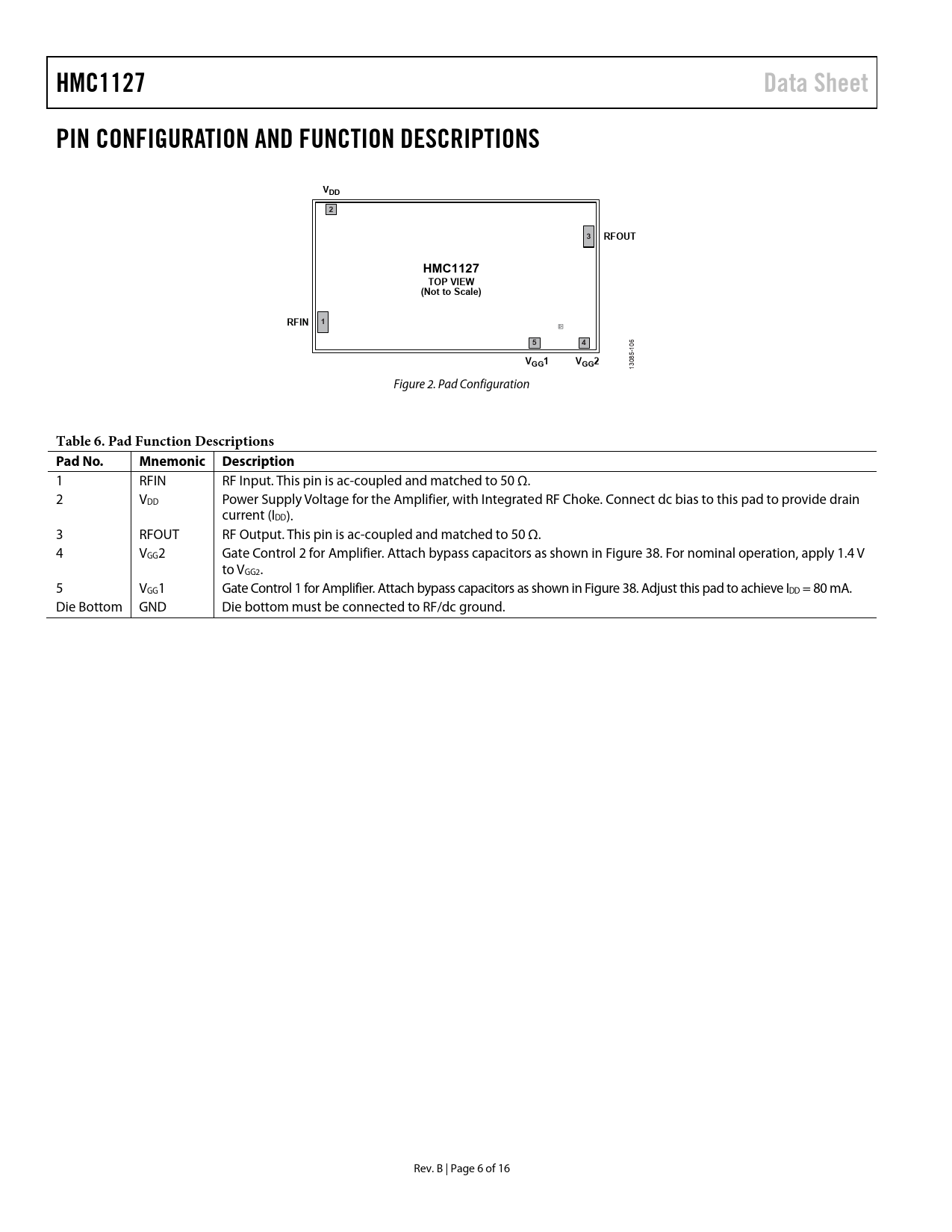 link to page 15 link to page 15 HMC1127Data SheetPIN CONFIGURATION AND FUNCTION DESCRIPTIONSVDD23RFOUTHMC1127TOP VIEW(Not to Scale)RFIN 154 106 VGG1VGG2 13085- Figure 2. Pad Configuration Table 6. Pad Function Descriptions Pad No.Mnemonic Description 1 RFIN RF Input. This pin is ac-coupled and matched to 50 Ω. 2 VDD Power Supply Voltage for the Amplifier, with Integrated RF Choke. Connect dc bias to this pad to provide drain current (IDD). 3 RFOUT RF Output. This pin is ac-coupled and matched to 50 Ω. 4 VGG2 Gate Control 2 for Amplifier. Attach bypass capacitors as shown in Figure 38. For nominal operation, apply 1.4 V to VGG2. 5 VGG1 Gate Control 1 for Amplifier. Attach bypass capacitors as shown in Figure 38. Adjust this pad to achieve IDD = 80 mA. Die Bottom GND Die bottom must be connected to RF/dc ground. Rev. B | Page 6 of 16 Document Outline FEATURES APPLICATIONS FUNCTIONAL BLOCK DIAGRAM GENERAL DESCRIPTION REVISION HISTORY 2 GHz TO 8 GHz FREQUENCY RANGE 8 GHz TO 30 GHz FREQUENCY RANGE 30 GHz TO 40 GHz FREQUENCY RANGE 40 GHz TO 50 GHz FREQUENCY RANGE ESD CAUTION INTERFACE SCHEMATICS MOUNTING AND BONDING TECHNIQUES FOR MILLIMETERWAVE GAAS MMICS Handling Precautions Mounting Wire Bonding ASSEMBLY DIAGRAM ORDERING GUIDE
