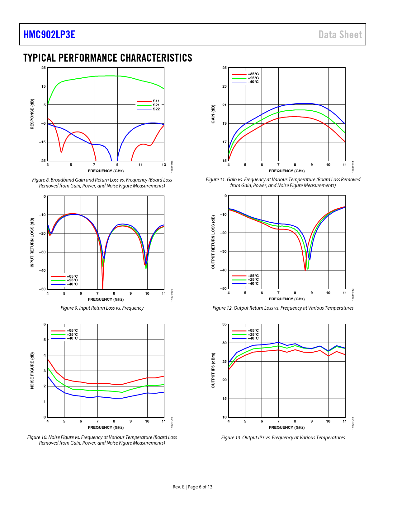 HMC902LP3EData SheetTYPICAL PERFORMANCE CHARACTERISTICS2525+85°C +25°C –40°C1523) BS115S2121S22B)SE (ddNN ( AI–5G19ESPO R–1517–2515 1 1 35791113 008 4567891011 0 FREQUENCY (GHz) 14524- FREQUENCY (GHz) 14524- Figure 8. Broadband Gain and Return Loss vs. Frequency (Board Loss Figure 11. Gain vs. Frequency at Various Temperature (Board Loss Removed Removed from Gain, Power, and Noise Figure Measurements) from Gain, Power, and Noise Figure Measurements) 00–10–10B)B)dd((SSSSOO–20–20URN LURN LTT–30RE–30REUTUTPINPUT O–40–40+85°C+85°C+25°C+25°C–40°C–40°C–50–504567891011 009 4567891011 012 FREQUENCY (GHz)FREQUENCY (GHz) 14524- 14524- Figure 9. Input Return Loss vs. Frequency Figure 12. Output Return Loss vs. Frequency at Various Temperatures 635+85°C+85°C+25°C+25°C5–40°C–40°C30)4dB (Bm)Ed25R3 ( P3IFIGUUTEP20OISUT2NO1510104567891011 010 4567891011 013 FREQUENCY (GHz) 14524- FREQUENCY (GHz) 14524- Figure 10. Noise Figure vs. Frequency at Various Temperature (Board Loss Figure 13. Output IP3 vs. Frequency at Various Temperatures Removed from Gain, Power, and Noise Figure Measurements) Rev. E | Page 6 of 13 Document Outline FEATURES APPLICATIONS FUNCTIONAL BLOCK DIAGRAM GENERAL DESCRIPTION TABLE OF CONTENTS REVISION HISTORY SPECIFICATIONS ELECTRICAL SPECIFICATIONS ABSOLUTE MAXIMUM RATINGS ESD CAUTION PIN CONFIGURATION AND FUNCTION DESCRIPTIONS INTERFACE SCHEMATICS TYPICAL PERFORMANCE CHARACTERISTICS THEORY OF OPERATION APPLICATIONS INFORMATION EVALUATION PRINTED CIRCUIT BOARD (PCB) APPLICATION CIRCUITS OUTLINE DIMENSIONS ORDERING GUIDE