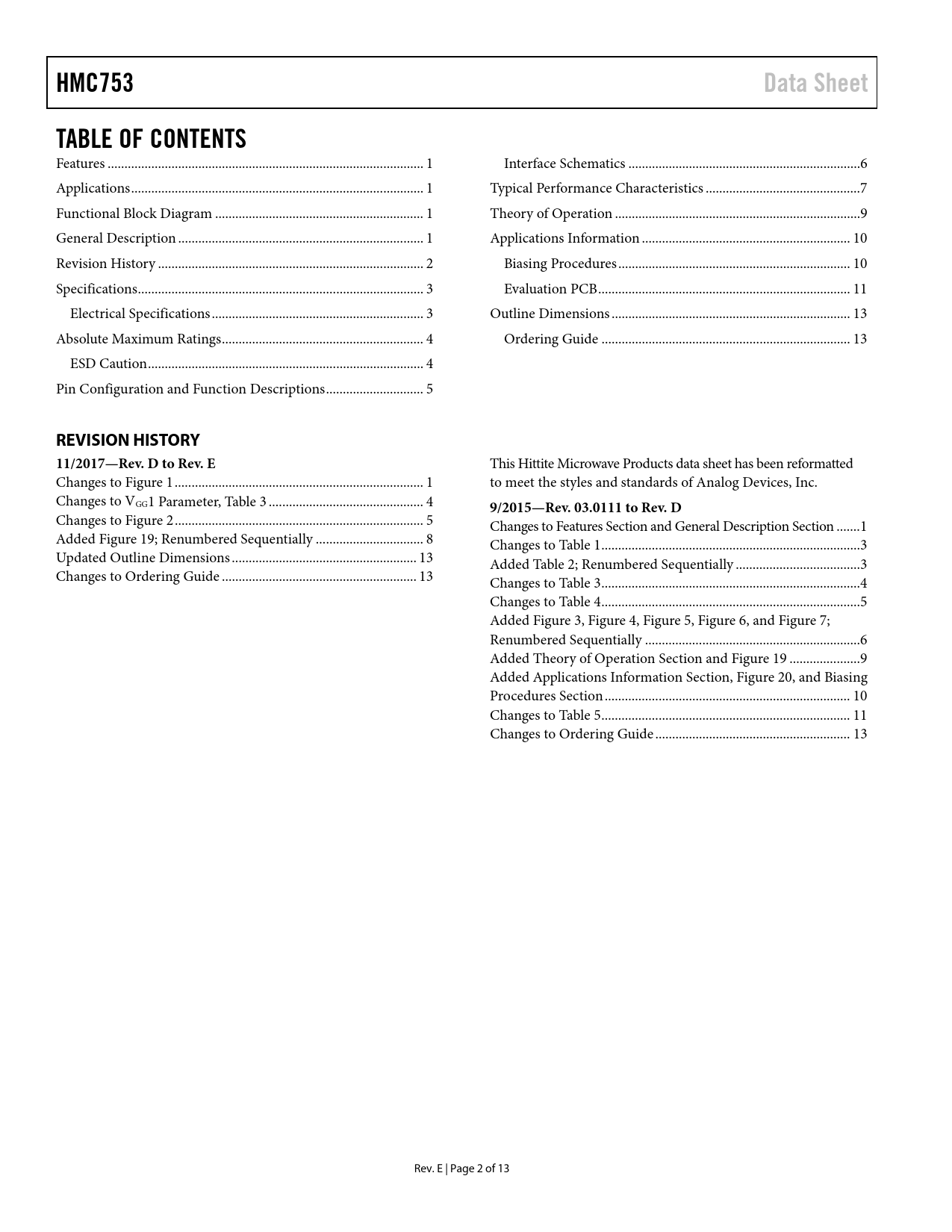 Páginas / Página13 / 2 — HMC753. Data Sheet. TABLE OF CONTENTS. REVISION HISTORY 11/2017—Rev. D to …