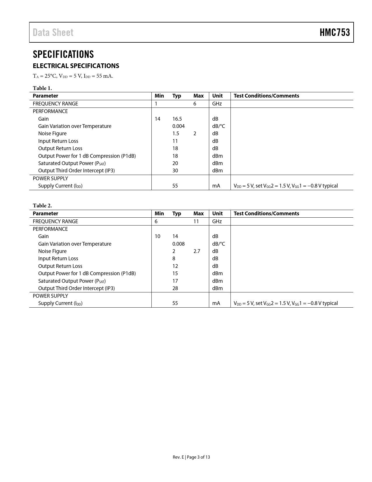 Páginas / Página13 / 3 — Data Sheet. HMC753. SPECIFICATIONS ELECTRICAL SPECIFICATIONS. Table 1. …