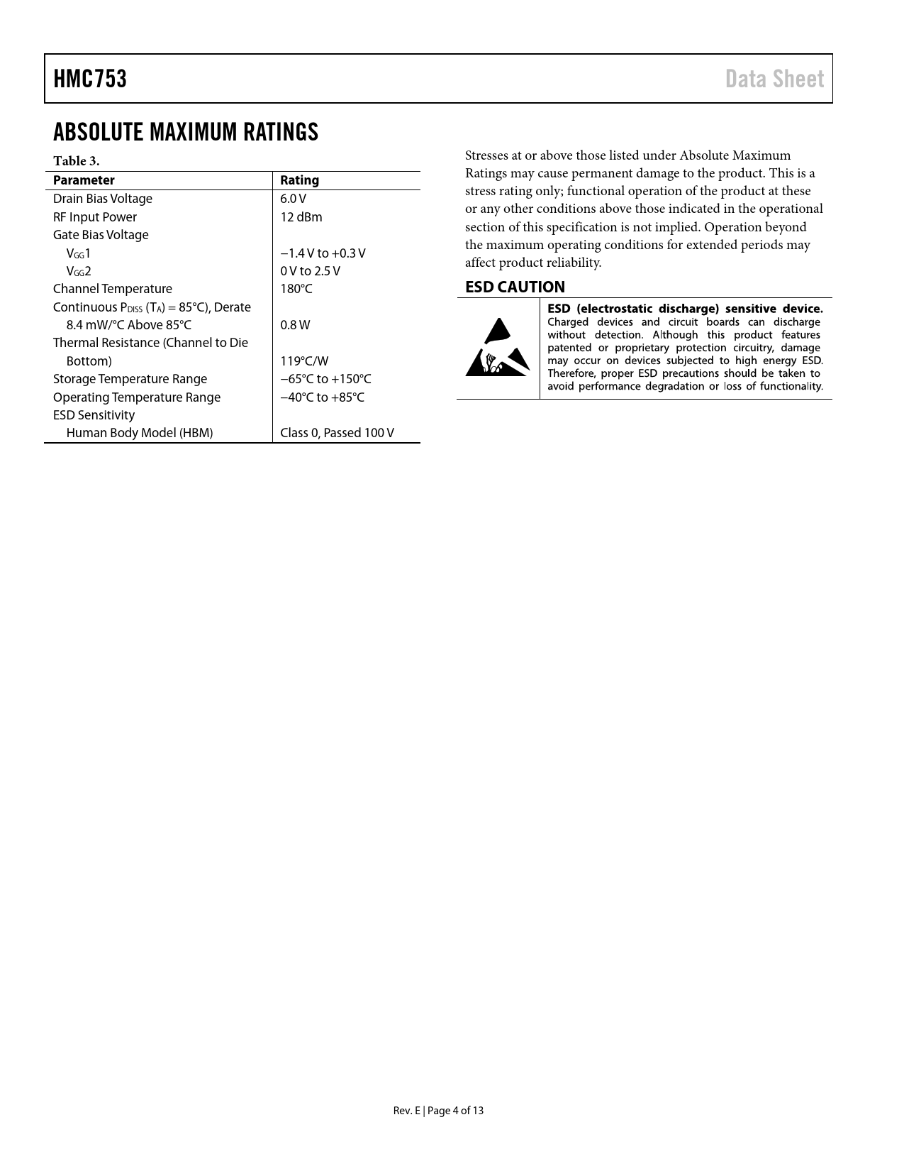 Páginas / Página13 / 4 — HMC753. Data Sheet. ABSOLUTE MAXIMUM RATINGS Table 3. Parameter. Rating. …