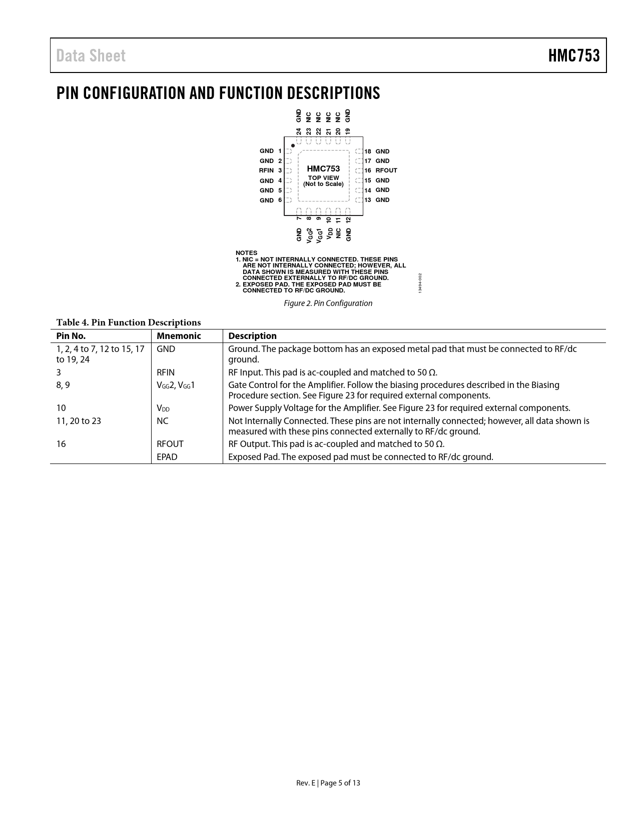 Páginas / Página13 / 5 — Data Sheet. HMC753. PIN CONFIGURATION AND FUNCTION DESCRIPTIONS. GND 1. …
