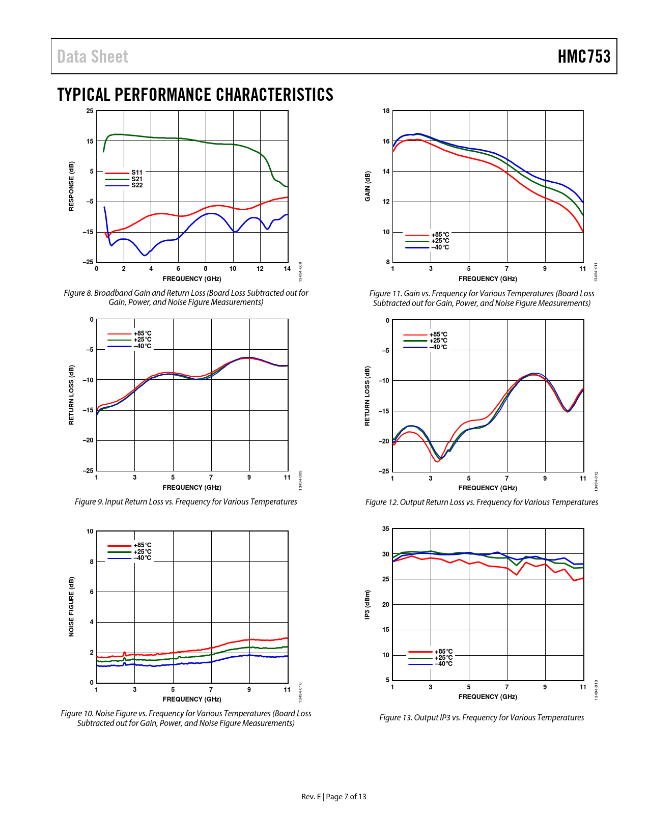 13494- Figure 8. Broadband Gain and Return Loss (Board Loss Subtracted out for Figure 11. Gain vs. Frequency for Various Temperatures (Board Loss Gain, Power, and Noise Figure Measurements) Subtracted out for Gain, Power, and Noise Figure Measurements)