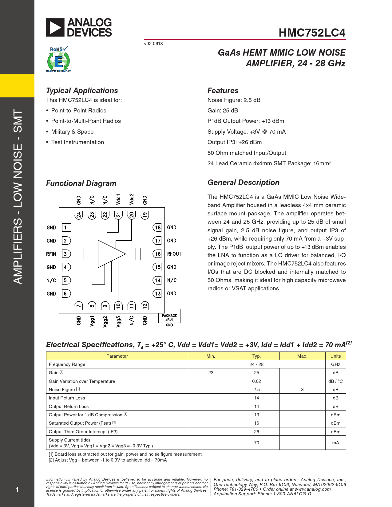 O The HMC752LC4 is a GaAs MMIC Low Noise Wide- band Amplifier housed in a leadless 4x4 mm ceramic surface mount package. The amplifier operates bet- S - L ween 24 and 28 GHz, providing up to 25 dB of small R signal gain, 2.5 dB noise figure, and output IP3 of IE +26 dBm, while requiring only 70 mA from a +3V sup- ply. The P1dB output power of up to +13 dBm enables LIF the LNA to function as a LO driver for balanced, I/Q P or image reject mixers. The HMC752LC4 also features M I/Os that are DC blocked and internal y matched to A 50 Ohms, making it ideal for high capacity microwave radios or VSAT applications.