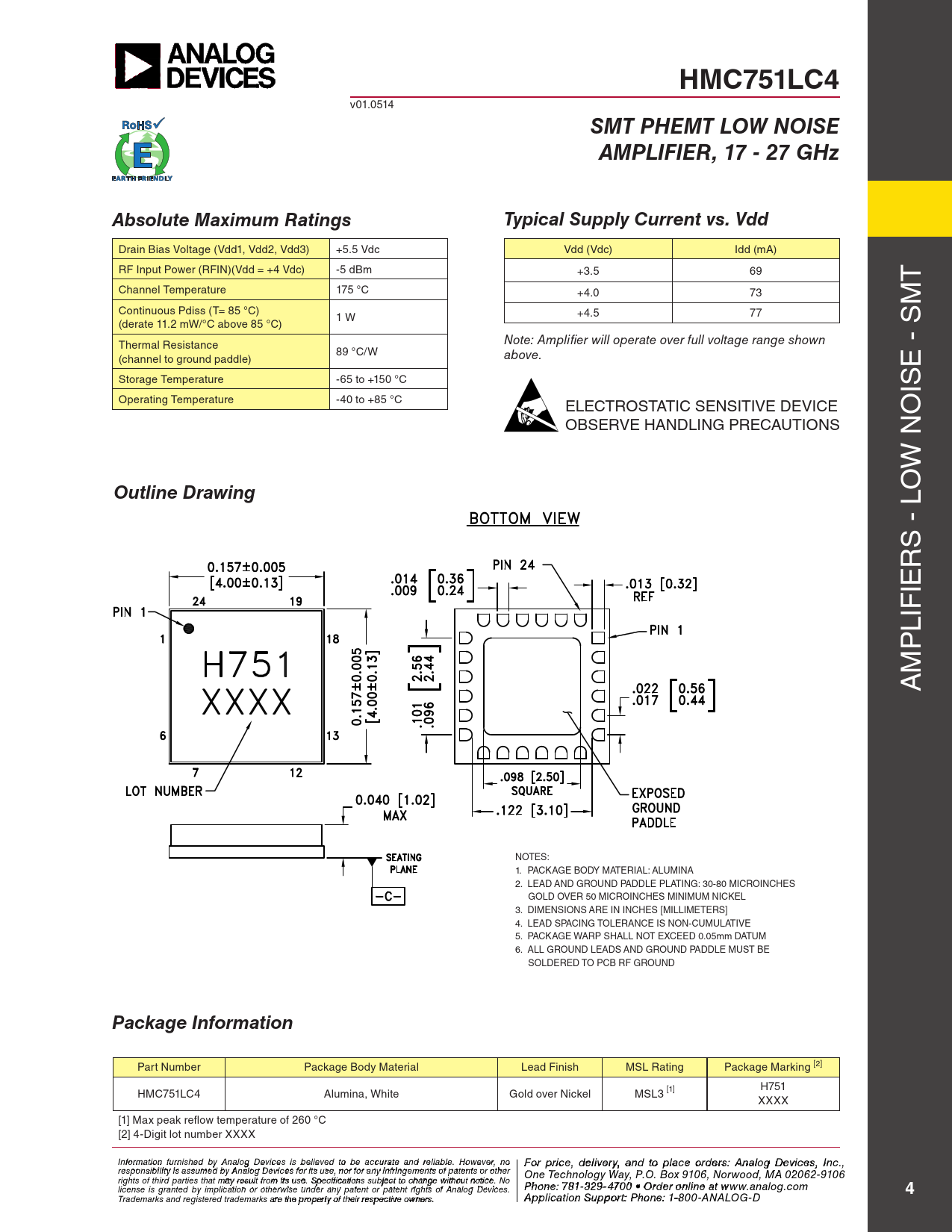 HMC751LC4. SMT pHEMT LOW NOISE. AMpLIFIER, 17 - 27 GHz. Absolute Maximum Ratings. Typical Supply Current vs. Vdd. Outline Drawing