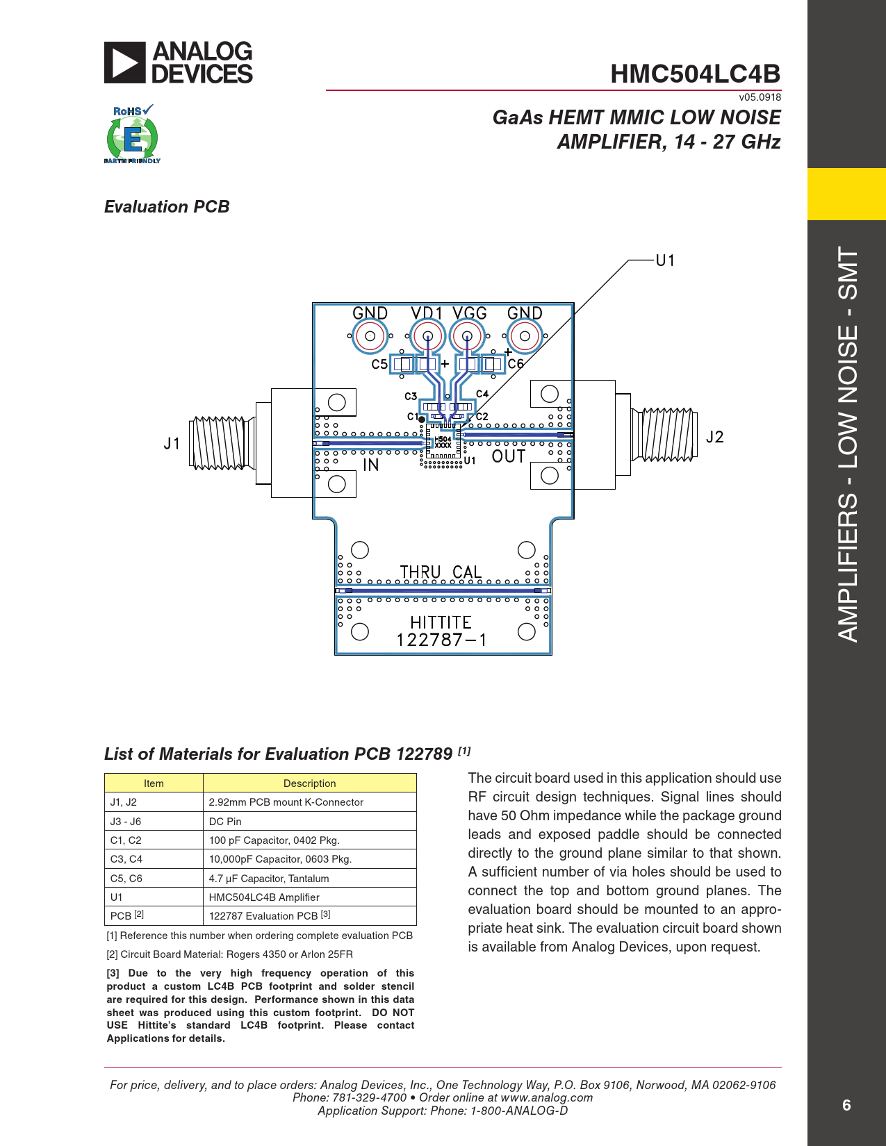 HMC504LC4B v05.0918 GaAs HEMT MMIC LOW NOISEAMPLIFIER, 14 - 27 GHzEvaluation PCB T M E - S IS O W N O S - L R IE LIF P M A List of Materials for Evaluation PCB 122789 [1] Item Description The circuit board used in this application should use J1, J2 2.92mm PCB mount K-Connector RF circuit design techniques. Signal lines should have 50 Ohm impedance while the package ground J3 - J6 DC Pin leads and exposed paddle should be connected C1, C2 100 pF Capacitor, 0402 Pkg. directly to the ground plane similar to that shown. C3, C4 10,000pF Capacitor, 0603 Pkg. A sufficient number of via holes should be used to C5, C6 4.7 µF Capacitor, Tantalum connect the top and bottom ground planes. The U1 HMC504LC4B Amplifier evaluation board should be mounted to an appro- PCB [2] 122787 Evaluation PCB [3] priate heat sink. The evaluation circuit board shown [1] Reference this number when ordering complete evaluation PCB is available from Analog Devices, upon request. [2] Circuit Board Material: Rogers 4350 or Arlon 25FR [3] Due to the very high frequency operation of thisproduct a custom LC4B PCB footprint and solder stencilare required for this design. Performance shown in this data sheet was produced using this custom footprint. DO NOT USE Hittite’s standard LC4B footprint. Please contact Applications for details. For price, delivery, and to place orders: Analog Devices, Inc., One Technology Way, P.O. Box 9106, Norwood, MA 02062-9106 Phone: 781-329-4700 • Order online at www.analog.com Application Support: Phone: 1-800-ANALOG-D 6 Document Outline Typical Applications Features Functional Diagram General Description Electrical Specifications Gain, Noise Figure & Power vs. Supply Voltage @ 21 GHz Power Compression @ 21 GHz Reverse Isolation vs. Temperature Psat vs. Temperature P1dB vs. Temperature Output IP3 vs. Temperature Noise Figure vs. Temperature Output Return Loss vs. Temperature Input Return Loss vs. Temperature Gain vs. Temperature Broadband Gain & Return Loss Absolute Maximum Ratings Outline Drawing Pin Descriptions Application Circuit Evaluation PCB List of Materials