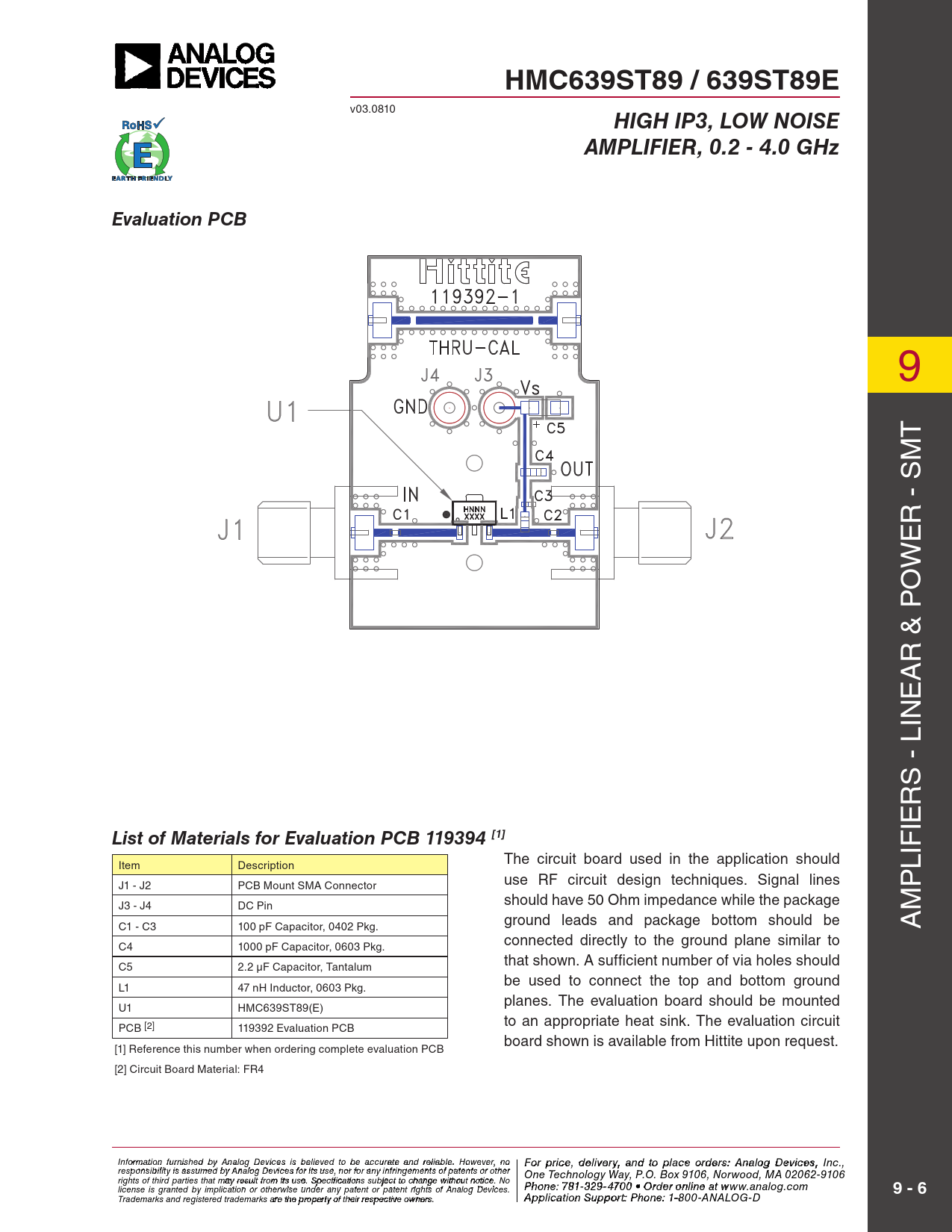 HMC639ST89 / 639ST89E. HIGH IP3, LOW NOISE. AMPLIFIER, 0.2 - 4.0 GHz. Evaluation PCB
