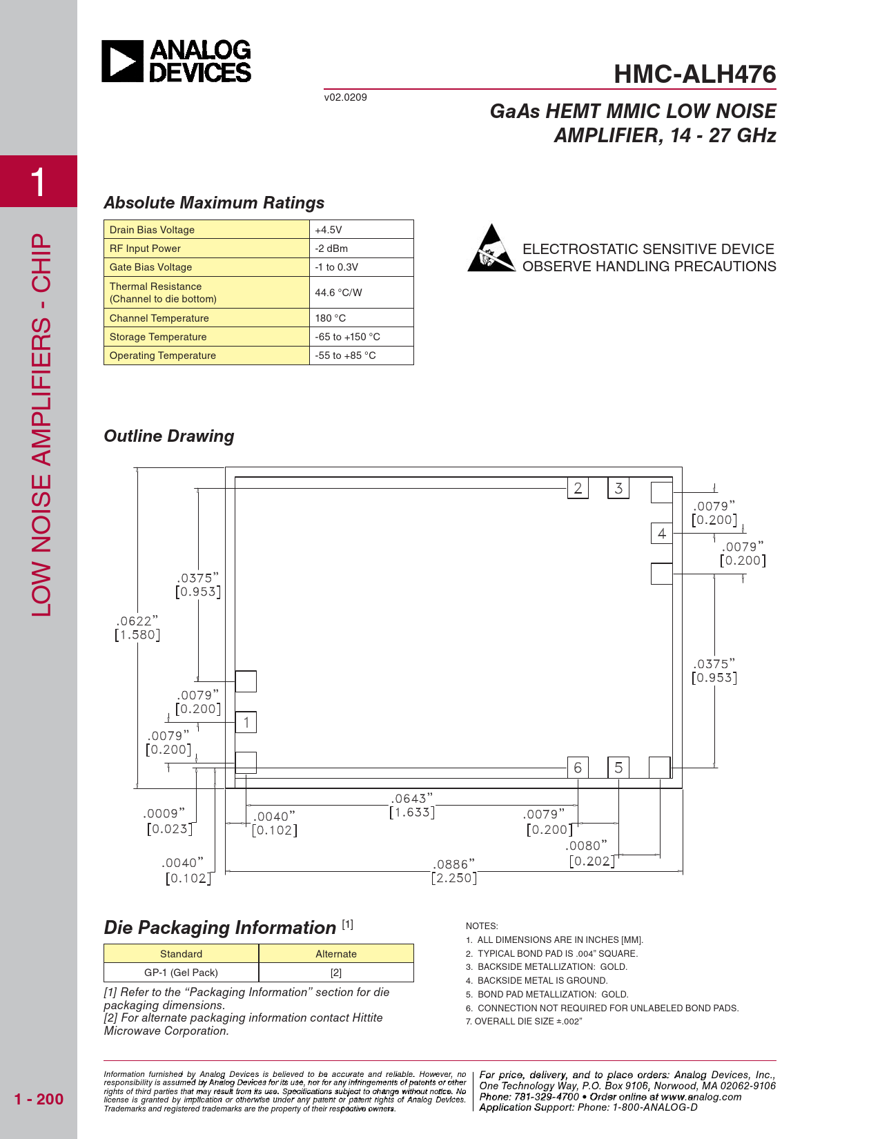 HMC-ALH476. GaAs HEMT MMIC LOW NOISE. AMPLIFIER, 14 - 27 GHz. Absolute Maximum Ratings. Outline Drawing
