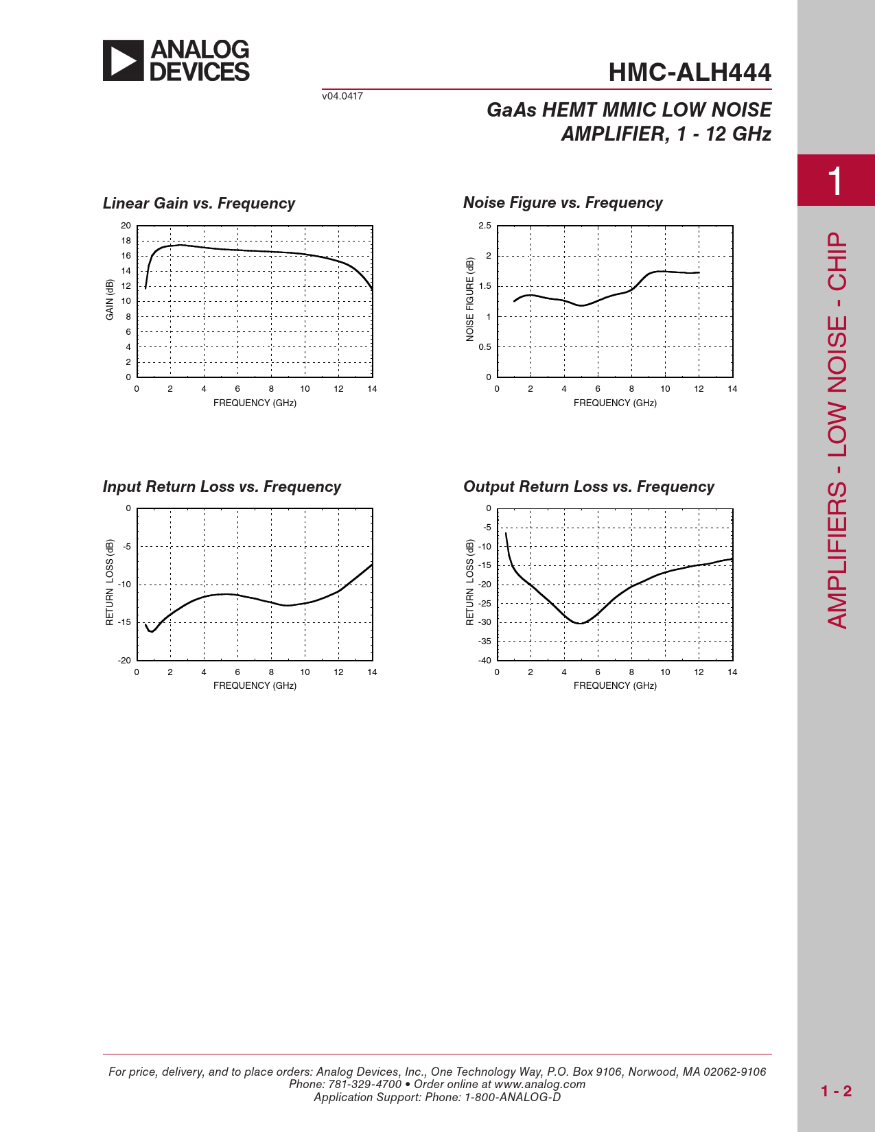 HMC-ALH444 v04.0417 GaAs HEMT MMIC LOW NOISEAMPLIFIER, 1 - 12 GHz 1 Linear Gain vs. FrequencyNoise Figure vs. Frequency 20 2.5 18 16 2 IP 14 (dB) H 12 1.5 (dB) 10 FIGURE GAIN 8 1 6 E - C NOISE 4 0.5 IS 2 0 0 O 0 2 4 6 8 10 12 14 0 2 4 6 8 10 12 14 FREQUENCY (GHz) FREQUENCY (GHz) W N O Input Return Loss vs. FrequencyOutput Return Loss vs. Frequency S - L 0 0 R -5 IE -5 -10 (dB) (dB) -15 LIF LOSS -10 LOSS -20 P -25 M RETURN -15 RETURN -30 A -35 -20 -40 0 2 4 6 8 10 12 14 0 2 4 6 8 10 12 14 FREQUENCY (GHz) FREQUENCY (GHz) For price, delivery, and to place orders: Analog Devices, Inc., One Technology Way, P.O. Box 9106, Norwood, MA 02062-9106 Phone: 781-329-4700 • Order online at www.analog.com 1 - 2 Application Support: Phone: 1-800-ANALOG-D