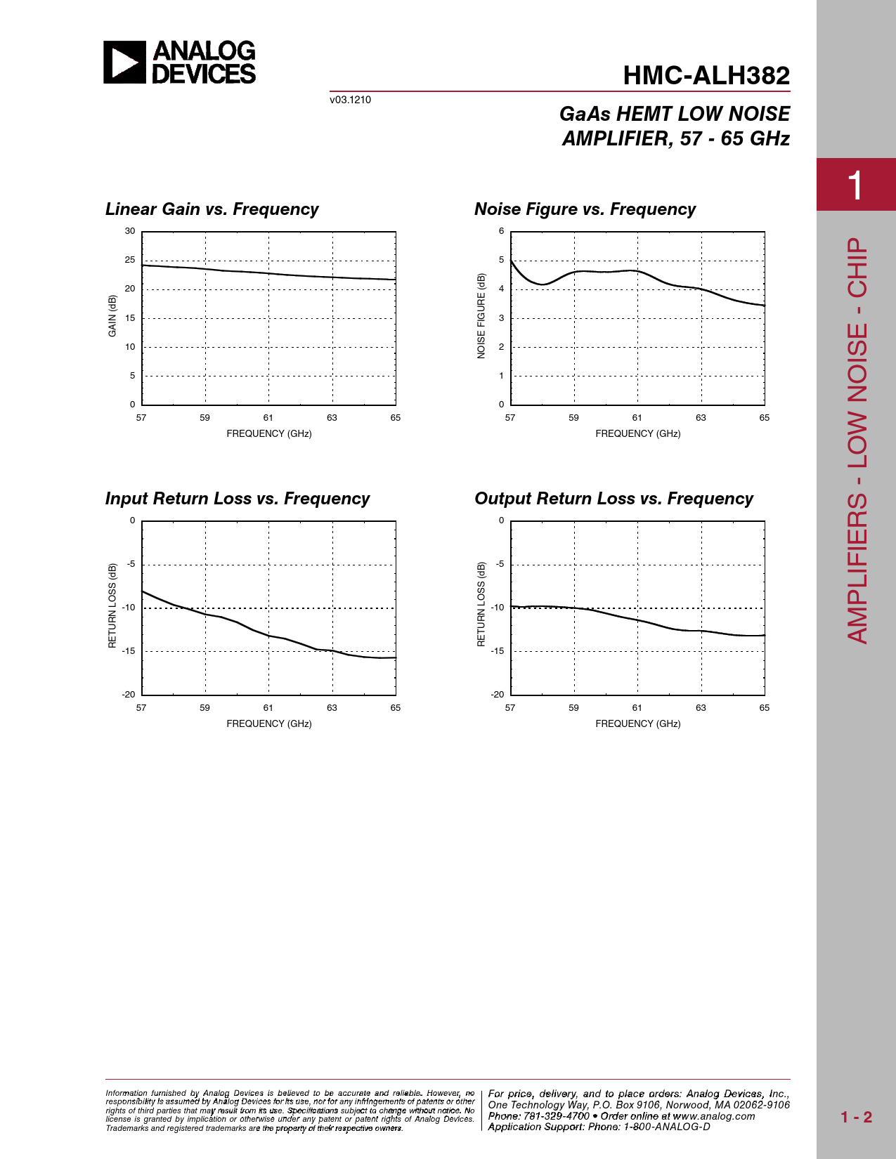 HMC-ALH382 v03.1210 GaAs HEMT LOW NOISEAMPLIFIER, 57 - 65 GHz 1 Linear Gain vs. FrequencyNoise Figure vs. Frequency 30 6 25 5 ip ) h 20 (dB 4 ) E R (dB U 15 IN IG 3 A F G E IS e - C 10 2 O N is 5 1 o 0 0 57 59 61 63 65 57 59 61 63 65 FREQUENCY (GHz) FREQUENCY (GHz) w n o Input Return Loss vs. FrequencyOutput Return Loss vs. Frequency s - l 0 0 r ie ) -5 ) -5 (dB (dB S S S lif S LO -10 LO -10 p N N R R U U m T T E E R R A -15 -15 -20 -20 57 59 61 63 65 57 59 61 63 65 FREQUENCY (GHz) FREQUENCY (GHz) Info F rmoatri op n rfiurcne is ,h ed d ebly ivAe n r al y o g aDn evdic eto s i p s bla eli c evee d otro dbe e ras: cc uH ratite tiatne d M reli iac bl reo . w Ho av wev e er , Cno o For price, delivery, and to place orders: Analog Devices, Inc., responsibility is assumed by Analog Devices for its use, nor for any infringements of patents or other rporation, 20 Alpha Road, Chelmsford, MA 01824 One Technology Way, P.O. Box 9106, Norwood, MA 02062-9106 Phone: 978-250-3343 Fax: 978-250-3373 rights of third parties that may result from its use. Specifications subject to change without notice. No O P r h d o e ne r O : 7 n 81- -3li 2n 9 e - 4 a 7 t 0 ww 0 • O w rd .h e it r o tniltie n .c e ao t m license is granted by implication or otherwise under any patent or patent rights of Analog Devices. www.analog.com 1 - 2 Application Support: Pho Trademarks and registered trademarks are the property of their respective owners. ne: 978-250-33 A 4 p 3 p li coarti o ap n S p u s p @ po h rt itt : P ite ho . n c e o : 1m -800-ANALOG-D
