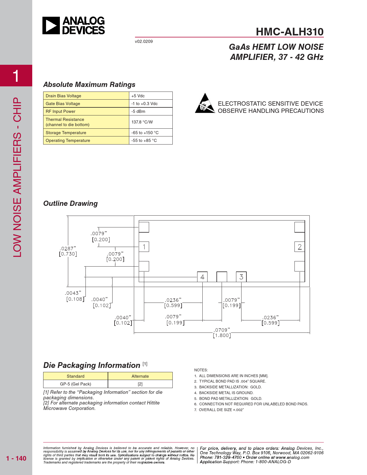 HMC-ALH310 v02.0209 GaAs HEMT LOW NOISEAMPLIFIER, 37 - 42 GHz 1 Absolute Maximum Ratings Drain Bias Voltage +5 Vdc IP Gate Bias Voltage -1 to +0.3 Vdc ELECTROSTATIC SENSITIVE DEVICE H RF Input Power -5 dBm OBSERVE HANDLING PRECAUTIONS C Thermal Resistance 137.8 °C/W - (channel to die bottom) Storage Temperature -65 to +150 °C RS Operating Temperature -55 to +85 °C IE IF L P M A E Outline Drawing IS O N W O L Die Packaging Information [1] NOTES: 1. ALL DIMENSIONS ARE IN INCHES [MM]. Standard Alternate 2. TYPICAL BOND PAD IS .004” SQUARE. GP-5 (Gel Pack) [2] 3. BACKSIDE METALLIZATION: GOLD. [1] Refer to the “Packaging Information” section for die 4. BACKSIDE METAL IS GROUND. packaging dimensions. 5. BOND PAD METALLIZATION: GOLD. [2] For alternate packaging information contact Hittite 6. CONNECTION NOT REQUIRED FOR UNLABELED BOND PADS. Microwave Corporation. 7. OVERALL DIE SIZE ±.002” Information furnish F ed obr pri y Anal ce, de og Device li s vie s r beyli, a eve nd to pla d to be accura ce o te and rder reliabl s e , pl . Ho ease co wever, no For price, delivery, and to place orders: Analog Devices, Inc., responsibility is assumed by Analog Devices for its use, nor for any infringements of patents or other ntact Hittite Microwave Corporation: One Technology Way, P.O. Box 9106, Norwood, MA 02062-9106 rights of third parties that may result from its use. Specifications subject to change without notice. No 1 - 140 20 Alpha Road, Chelmsford, MA 01824 Phone: 978 Phon - e 25 : 7 0 81--3 32 3 9 4 - 3 F 70 ax 0 • O : 978 rder on -li25 n 0 e a - t 33 ww 73 license is granted by implication or otherwise under any patent or patent rights of Analog Devices. w.analog.com Order On Trademarks and registered trademarks are the property of their respective owners. -line at www.h A it p tpite.co licatio m n Support: Phone: 1-800-ANALOG-D