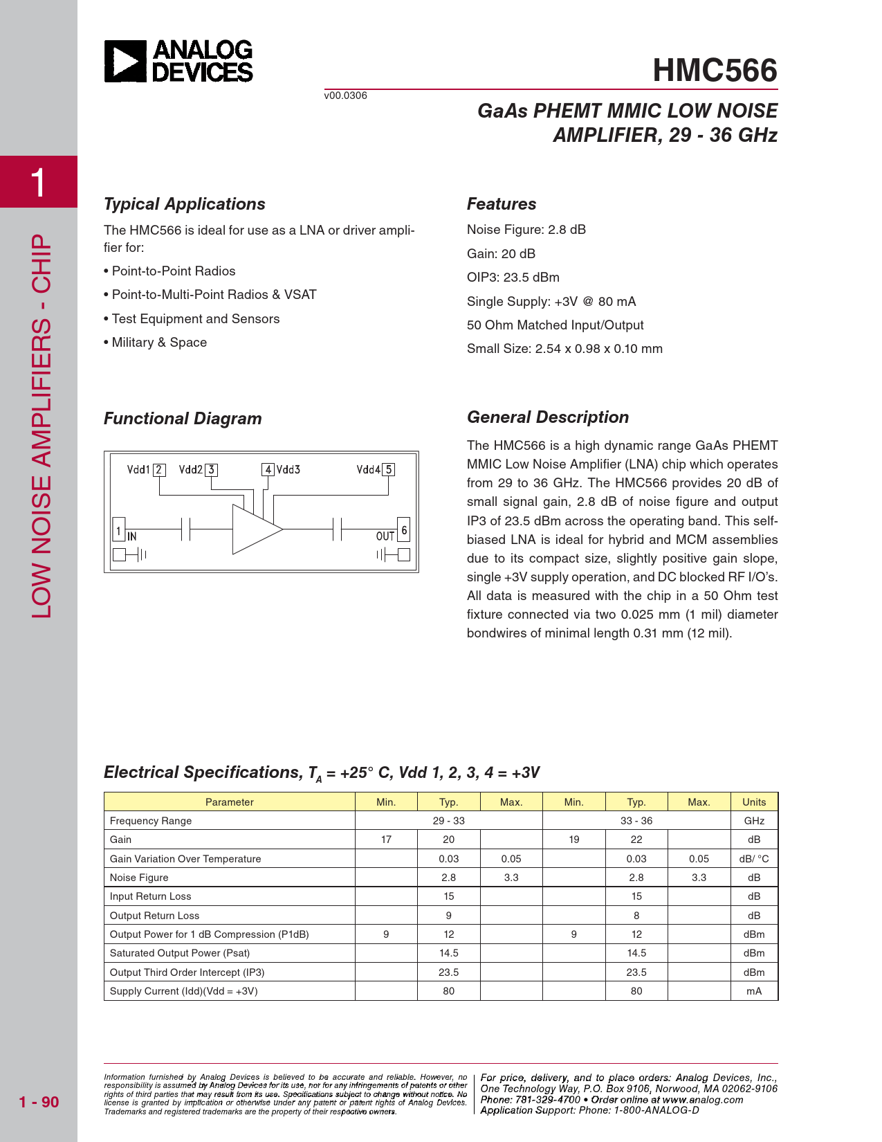 HMC566. GaAs PHEMT MMIC LOW NOISE. AMPLIFIER, 29 - 36 GHz. Typical Applications. Features. Functional Diagram. General Description