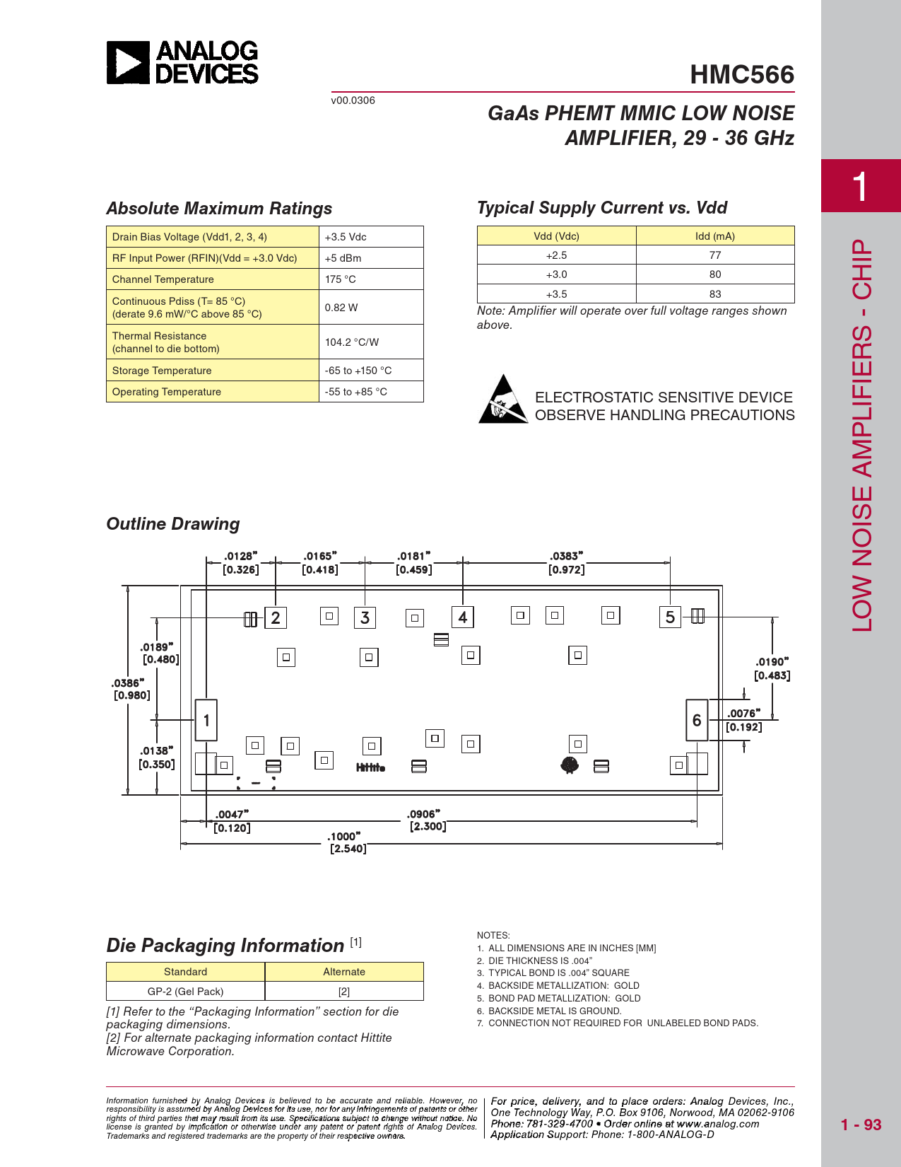 HMC566 v00.0306 GaAs PHEMT MMIC LOW NOISEAMPLIFIER, 29 - 36 GHz 1 Absolute Maximum RatingsTypical Supply Current vs. Vdd Drain Bias Voltage (Vdd1, 2, 3, 4) +3.5 Vdc Vdd (Vdc) Idd (mA) RF Input Power (RFIN)(Vdd = +3.0 Vdc) +5 dBm +2.5 77 IP +3.0 80 Channel Temperature 175 °C H +3.5 83 Continuous Pdiss (T= 85 °C) 0.82 W C (derate 9.6 mW/°C above 85 °C) Note: Amplifi er will operate over full voltage ranges shown - above. Thermal Resistance 104.2 °C/W (channel to die bottom) RS Storage Temperature -65 to +150 °C IE Operating Temperature -55 to +85 °C ELECTROSTATIC SENSITIVE DEVICE IF OBSERVE HANDLING PRECAUTIONS L P M A E Outline Drawing IS O N W O L NOTES: 1. ALL DIMENSIONS ARE IN INCHES [MM] Die Packaging Information [1] 2. DIE THICKNESS IS .004” Standard Alternate 3. TYPICAL BOND IS .004” SQUARE 4. BACKSIDE METALLIZATION: GOLD GP-2 (Gel Pack) [2] 5. BOND PAD METALLIZATION: GOLD [1] Refer to the “Packaging Information” section for die 6. BACKSIDE METAL IS GROUND. 7. CONNECTION NOT REQUIRED FOR UNLABELED BOND PADS. packaging dimensions. [2] For alternate packaging information contact Hittite Microwave Corporation. Information furnish F e o d r pri by An ce, de alog Devic leis vie s rby eli, a eve nd to pla d to be accur ce o ate an r d der relia s ble , pl . Ho ease co wever, no For price, delivery, and to place orders: Analog Devices, Inc., responsibility is assumed by Analog Devices for its use, nor for any infringements of patents or other ntact Hittite Microwave Corporation: One Technology Way, P.O. Box 9106, Norwood, MA 02062-9106 20 Alpha Road, Chelmsford, MA 01824 Phone rights of third parties that may result from its use. Specifications subject to change without notice. No : 978 Phon -e25 : 7 0 81 - - 3 3 3 29 4 - 3 F 470 ax 0 • O : 978 rder o - nl 25 in 0 e a - t 33 ww 73 license is granted by implication or otherwise under any patent or patent rights of Analog Devices. w.analog.com 1 - 93 Order On- Trademarks and registered trademarks are the property of their respective owners. line at www.hi A tptipte.co licatio m n Support: Phone: 1-800-ANALOG-D