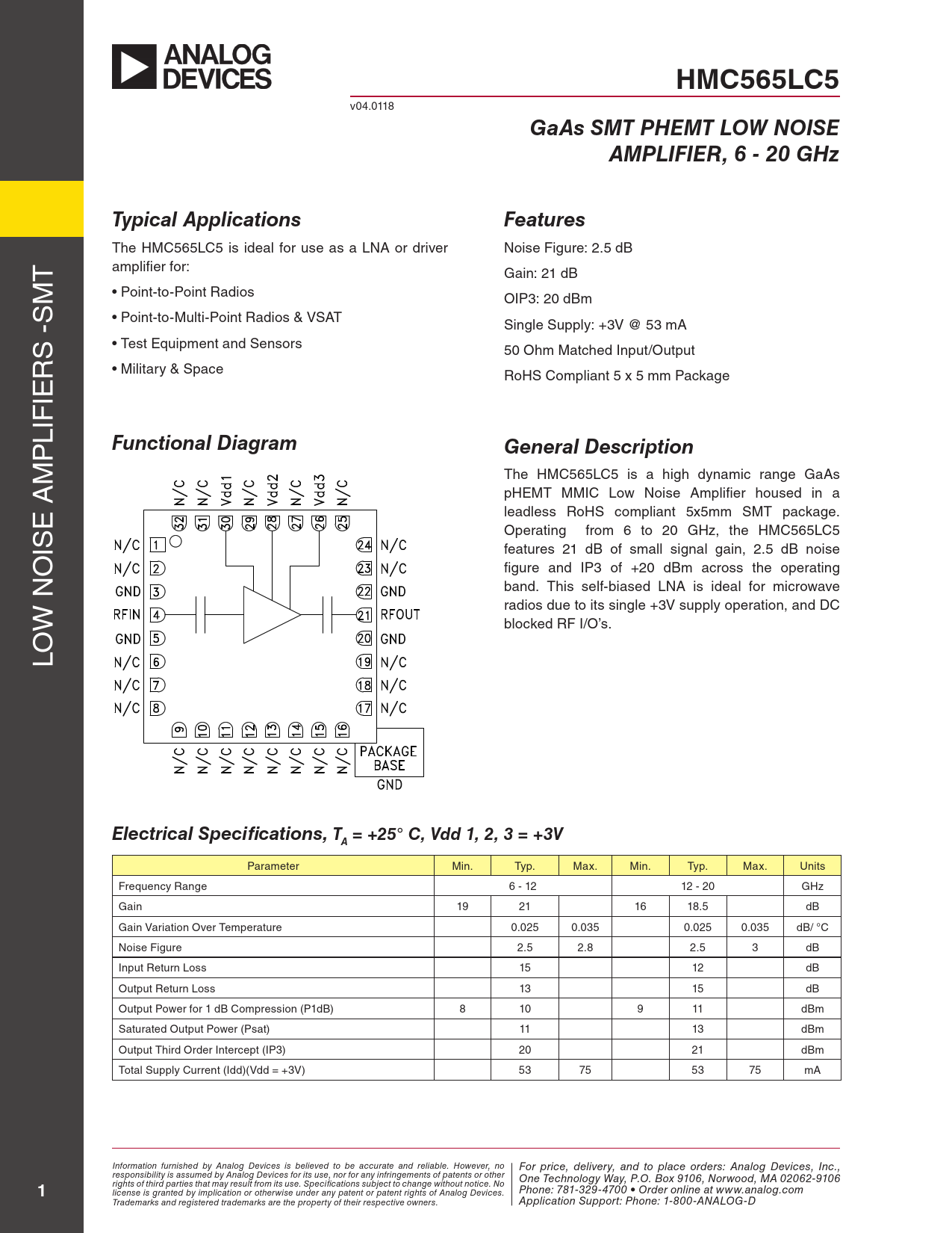 HMC565LC5. GaAs SMT PHEMT LOW NOISE. AMPLIFIER, 6 - 20 GHz. Typical Applications. Features. Functional Diagram. General Description