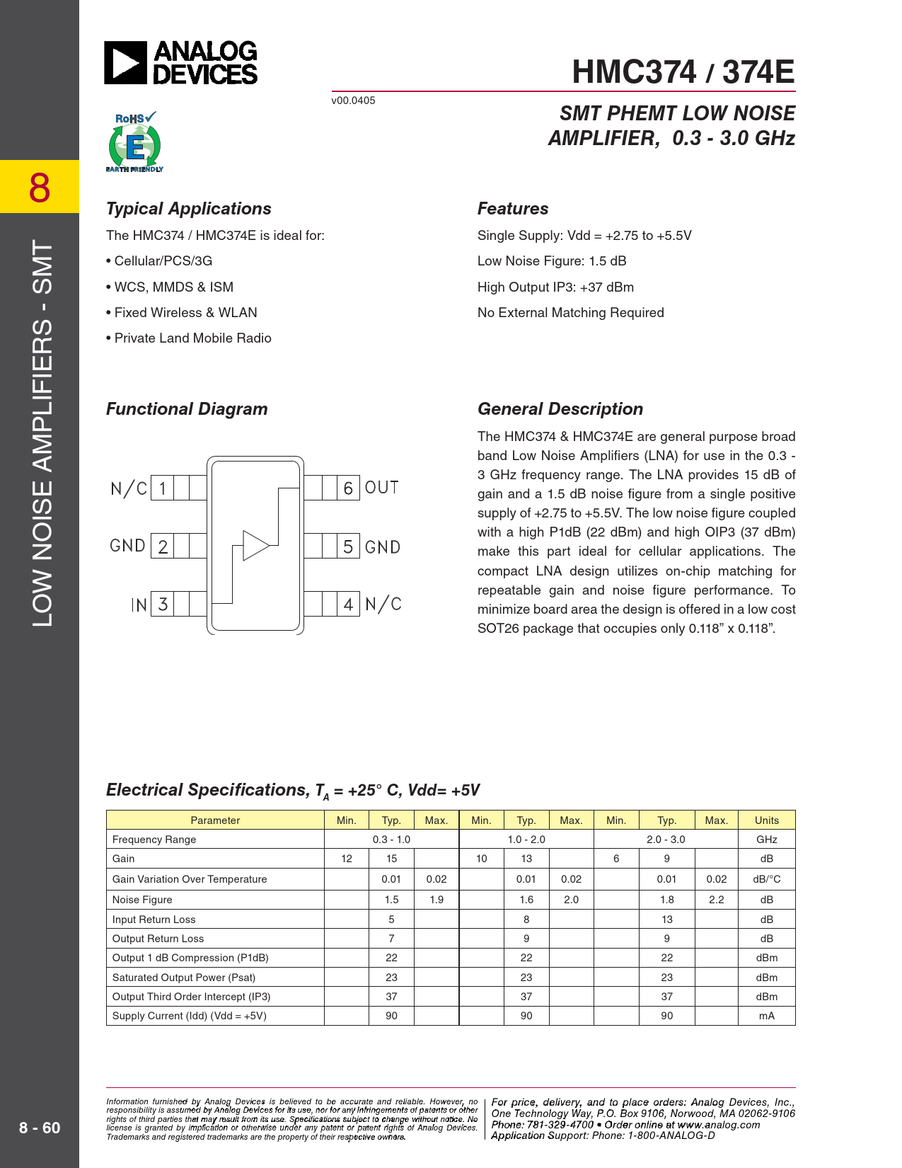 HMC374 / 374E. SMT PHEMT LOW NOISE. AMPLIFIER, 0.3 - 3.0 GHz. Typical Applications. Features. Functional Diagram