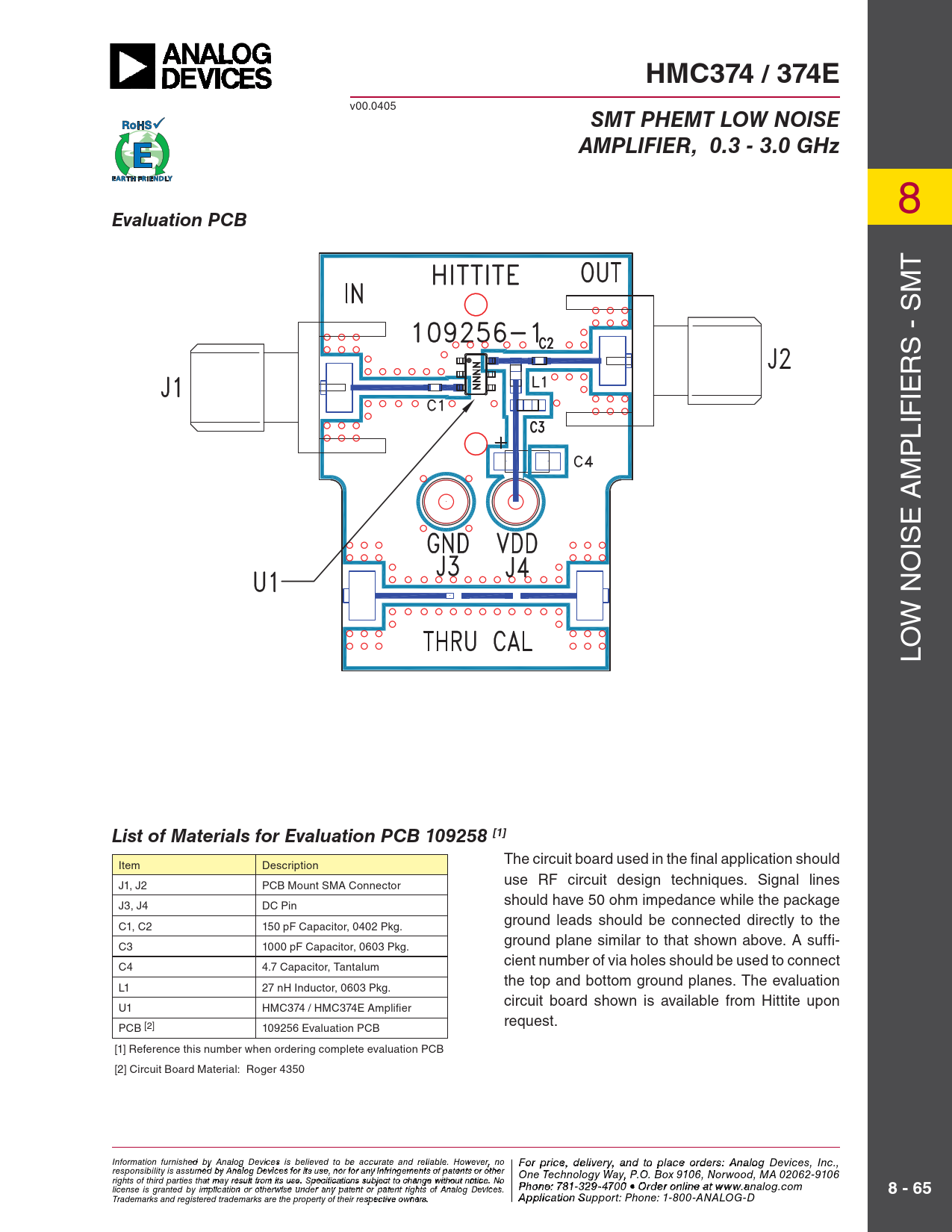 HMC374 / 374E v00.0405 SMT PHEMT LOW NOISEAMPLIFIER, 0.3 - 3.0 GHz 8 Evaluation PCB T - SM S R IE IF L P M E A IS W NO O L List of Materials for Evaluation PCB 109258 [1] The circuit board used in the fi nal application should Item Description use RF circuit design techniques. Signal lines J1, J2 PCB Mount SMA Connector should have 50 ohm impedance while the package J3, J4 DC Pin ground leads should be connected directly to the C1, C2 150 pF Capacitor, 0402 Pkg. ground plane similar to that shown above. A suffi- C3 1000 pF Capacitor, 0603 Pkg. cient number of via holes should be used to connect C4 4.7 Capacitor, Tantalum the top and bottom ground planes. The evaluation L1 27 nH Inductor, 0603 Pkg. circuit board shown is available from Hittite upon U1 HMC374 / HMC374E Amplifi er request. PCB [2] 109256 Evaluation PCB [1] Reference this number when ordering complete evaluation PCB [2] Circuit Board Material: Roger 4350 Information furnish F e o d r pri by An ce, de alog Devic leis vie s rbyeli, a eve nd to pla d to be accur ce o ate an r d der relia s ble , pl . Ho ease co wever, no For price, delivery, and to place orders: Analog Devices, Inc., responsibility is assumed by Analog Devices for its use, nor for any infringements of patents or other ntact Hittite Microwave Corporation: One Technology Way, P.O. Box 9106, Norwood, MA 02062-9106 20 Alpha Road, Chelmsford, MA 01824 Phone rights of third parties that may result from its use. Specifications subject to change without notice. No license is granted by implication or otherwise under any patent or patent rights of Analog Devices. : 978 Pho - n 25 e: 7 0- 81 33 2 4 9- 3 F 470 ax: 978 0 • Order o - n 25 lin 0 e a-t 3373 www.analog.com 8 - 65 Order On- Trademarks and registered trademarks are the property of their respective owners. line at www.hi A tptipte.co licatio m n Support: Phone: 1-800-ANALOG-D