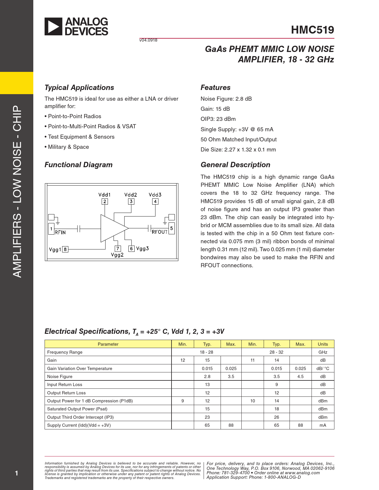 HMC519. GaAs PHEMT MMIC LOW NOISE. AMPLIFIER, 18 - 32 GHz. Typical Applications. Features. Functional Diagram. General Description