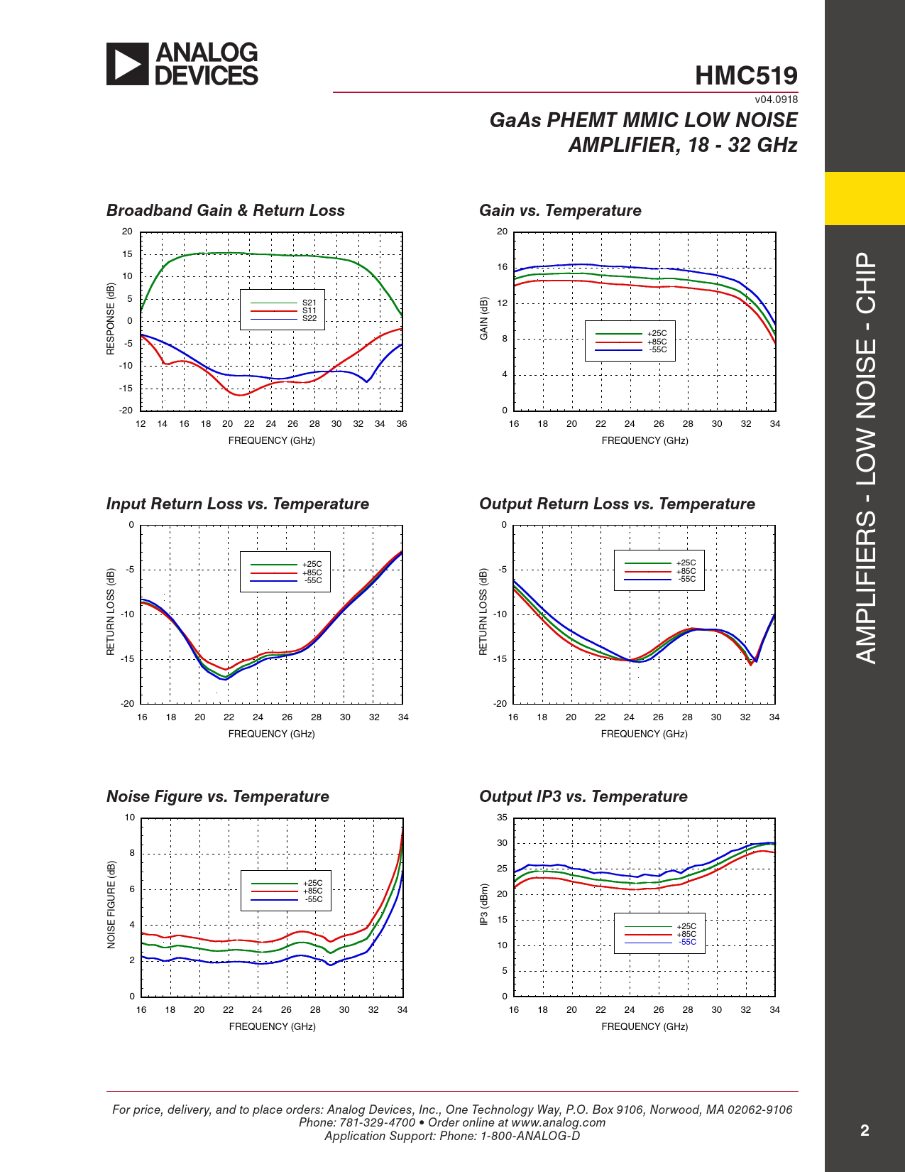 10 35 30 8 ) B d 25 ( +25C E ) 6 R +85C m U 20 -55C IG (dB F 3 E 15 4 IP +25C IS +85C O N 10 -55C 2 5 0 0 16 18 20 22 24 26 28 30 32 34 16 18 20 22 24 26 28 30 32 34 FREQUENCY (GHz) FREQUENCY (GHz) For price, delivery, and to place orders: Analog Devices, Inc., One Technology Way, P.O. Box 9106, Norwood, MA 02062-9106 Phone: 781-329-4700 • Order online at www.analog.com Application Support: Phone: 1-800-ANALOG-D