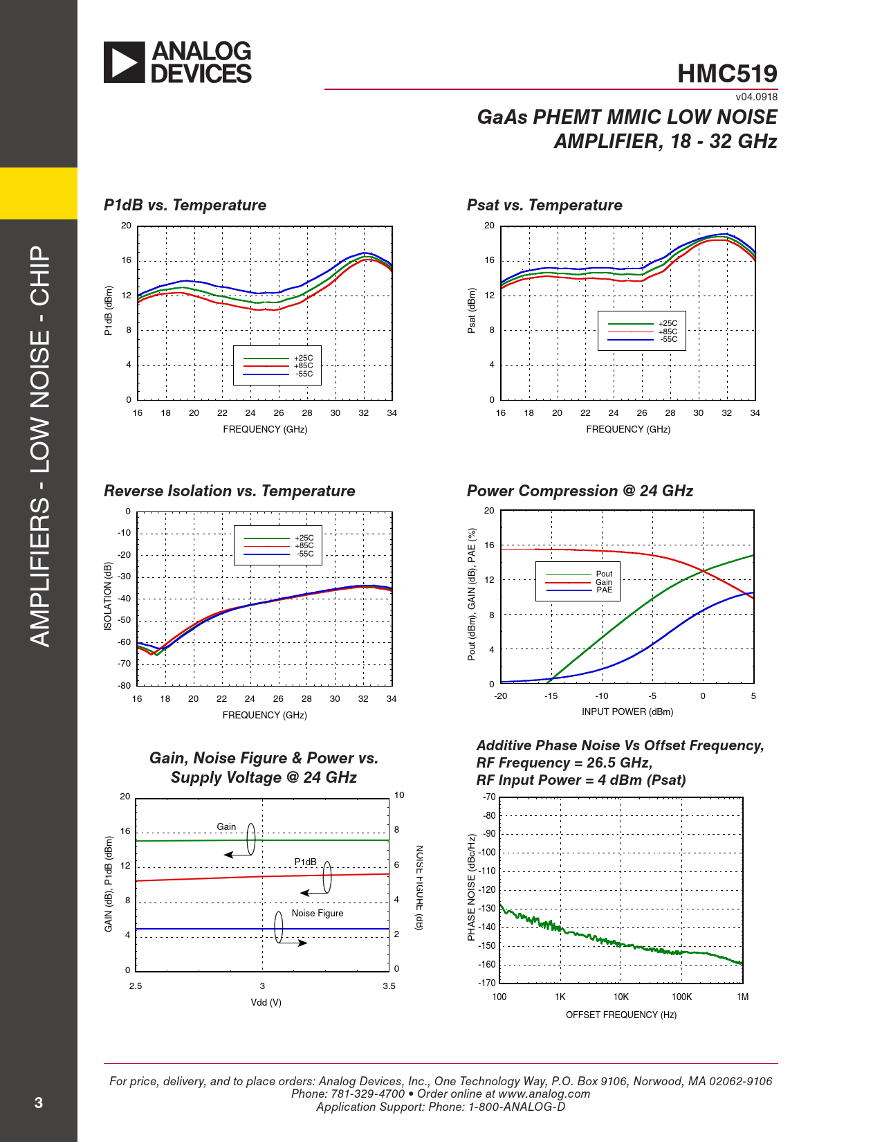 Additive Phase Noise Vs Offset Frequency, Gain, Noise Figure & Power vs. RF Frequency = 26.5 GHz, Supply Voltage @ 24 GHz RF Input Power = 4 dBm (Psat)