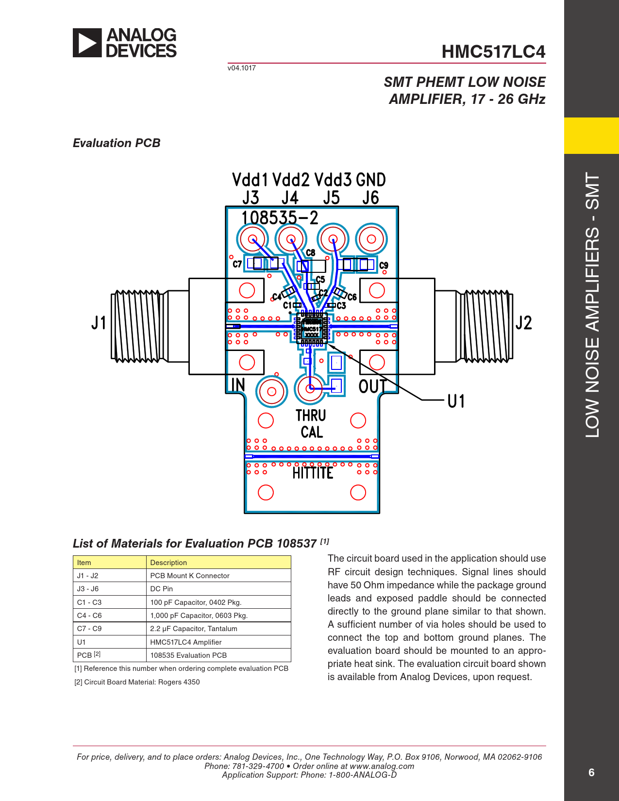 HMC517LC4 SMT PHEMT LOW NOISE AMPLIFIER, 17 - 26 GHz Evaluation PCB List of Materials for Evaluation PCB 108537 [1]