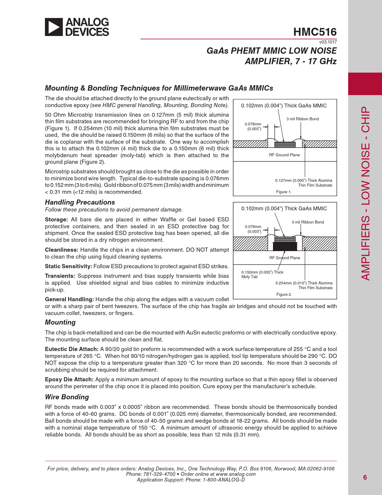 HMC516 v03.1017 GaAs PHEMT MMIC LOW NOISEAMPLIFIER, 7 - 17 GHzMounting & Bonding Techniques for Millimeterwave GaAs MMICs The die should be attached directly to the ground plane eutectical y or with conductive epoxy (see HMC general Handling, Mounting, Bonding Note). 0.102mm (0.004”) Thick GaAs MMIC 50 Ohm Microstrip transmission lines on 0.127mm (5 mil) thick alumina IP thin film substrates are recommended for bringing RF to and from the chip 3 mil Ribbon Bond 0.076mm H (Figure 1). If 0.254mm (10 mil) thick alumina thin film substrates must be (0.003”) used, the die should be raised 0.150mm (6 mils) so that the surface of the die is coplanar with the surface of the substrate. One way to accomplish this is to attach the 0.102mm (4 mil) thick die to a 0.150mm (6 mil) thick E - C molybdenum heat spreader (moly-tab) which is then attached to the RF Ground Plane IS ground plane (Figure 2). O Microstrip substrates should brought as close to the die as possible in order to minimize bond wire length. Typical die-to-substrate spacing is 0.076mm 0.127mm (0.005”) Thick Alumina to 0.152 mm (3 to 6 mils). Gold ribbon of 0.075 mm (3 mils) width and minimum Thin Film Substrate < 0.31 mm (<12 mils) is recommended. Figure 1. W N O Handling Precautions Follow these precautions to avoid permanent damage. 0.102mm (0.004”) Thick GaAs MMIC Storage: All bare die are placed in either Waffle or Gel based ESD 3 mil Ribbon Bond S - L protective containers, and then sealed in an ESD protective bag for 0.076mm (0.003”) R shipment. Once the sealed ESD protective bag has been opened, all die should be stored in a dry nitrogen environment. IE Cleanliness: Handle the chips in a clean environment. DO NOT attempt to clean the chip using liquid cleaning systems. RF Ground Plane LIF P Static Sensitivity: Fol ow ESD precautions to protect against ESD strikes. 0.150mm (0.005”) Thick M Transients: Suppress instrument and bias supply transients while bias Moly Tab A is applied. Use shielded signal and bias cables to minimize inductive 0.254mm (0.010”) Thick Alumina pick-up. Thin Film Substrate Figure 2. General Handling: Handle the chip along the edges with a vacuum col et or with a sharp pair of bent tweezers. The surface of the chip has fragile air bridges and should not be touched with vacuum col et, tweezers, or fingers. Mounting The chip is back-metal ized and can be die mounted with AuSn eutectic preforms or with electrical y conductive epoxy. The mounting surface should be clean and flat. Eutectic Die Attach: A 80/20 gold tin preform is recommended with a work surface temperature of 255 °C and a tool temperature of 265 °C. When hot 90/10 nitrogen/hydrogen gas is applied, tool tip temperature should be 290 °C. DO NOT expose the chip to a temperature greater than 320 °C for more than 20 seconds. No more than 3 seconds of scrubbing should be required for attachment. Epoxy Die Attach: Apply a minimum amount of epoxy to the mounting surface so that a thin epoxy fil et is observed around the perimeter of the chip once it is placed into position. Cure epoxy per the manufacturer’s schedule. Wire Bonding RF bonds made with 0.003” x 0.0005” ribbon are recommended. These bonds should be thermosonical y bonded with a force of 40-60 grams. DC bonds of 0.001” (0.025 mm) diameter, thermosonical y bonded, are recommended. Ball bonds should be made with a force of 40-50 grams and wedge bonds at 18-22 grams. All bonds should be made with a nominal stage temperature of 150 °C. A minimum amount of ultrasonic energy should be applied to achieve reliable bonds. All bonds should be as short as possible, less than 12 mils (0.31 mm). For price, delivery, and to place orders: Analog Devices, Inc., One Technology Way, P.O. Box 9106, Norwood, MA 02062-9106 Phone: 781-329-4700 • Order online at www.analog.com Application Support: Phone: 1-800-ANALOG-D 6