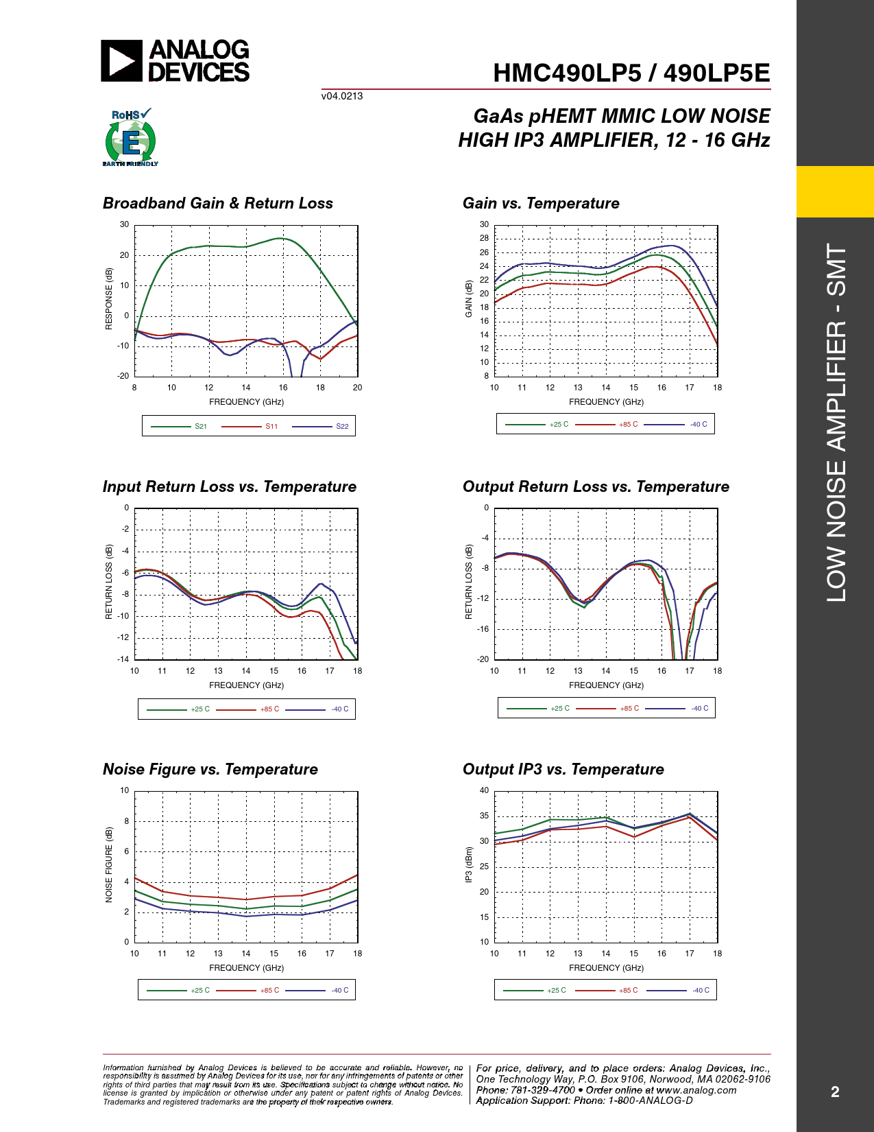 HMC490LP5 / 490LP5E v04.0213 GaAs pHEMT MMIC LOW NOISEHIGH IP3 AMPLIFIER, 12 - 16 GHzBroadband Gain & Return LossGain vs. Temperature 30 30 28 20 26 T 24 (dB) 22 M 10 (dB) 20 18 0 GAIN 16 RESPONSE 14 R - S -10 12 10 IE -20 8 8 10 12 14 16 18 20 10 11 12 13 14 15 16 17 18 LIF FREQUENCY (GHz) FREQUENCY (GHz) P S21 S11 S22 +25 C +85 C -40 C M E A Input Return Loss vs. TemperatureOutput Return Loss vs. Temperature IS 0 0 O -2 -4 -4 (dB) (dB) -6 -8 W N LOSS LOSS -8 -12 LO RETURN -10 RETURN -16 -12 -14 -20 10 11 12 13 14 15 16 17 18 10 11 12 13 14 15 16 17 18 FREQUENCY (GHz) FREQUENCY (GHz) +25 C +85 C -40 C +25 C +85 C -40 C Noise Figure vs. TemperatureOutput IP3 vs. Temperature 10 40 35 8 ) (dB 30 E ) R 6 U IG (dBm 25 F E 4 IP3 IS O 20 N 2 15 0 10 10 11 12 13 14 15 16 17 18 10 11 12 13 14 15 16 17 18 FREQUENCY (GHz) FREQUENCY (GHz) +25 C +85 C -40 C +25 C +85 C -40 C Inf F or o m r p atio r n ifc ur e n , d ishe e d lbiv y e A r n y a alog n D d t evic o p es is la beclie o eved rd to ebre sa: H ccur iattti e tae M nd re ilicarbloew . H a o ve C wever, o n rp o For price, delivery, and to place orders: Analog Devices, Inc., responsibility is assumed by Analog Devices for its use, nor for any infringements of patents or other oration, 2 Elizabeth Drive, Chelmsford, MA 01824 One Technology Way, P.O. Box 9106, Norwood, MA 02062-9106 Phone: 978-250-3343 Fax: 978-250-3373 O rights of third parties that may result from its use. Specifications subject to change without notice. No P rd hone e r O : 7 n 81- -3li 2n 9 e a -47 t w 0 w 0 • O w rd .h e it r o t niltie n .c e ao t m license is granted by implication or otherwise under any patent or patent rights of Analog Devices. www.analog.com 2 Application Support: Pho Trademarks and registered trademarks are the property of their respective owners. ne: 978-250-33 A 4 p 3 p o lica rti a o p n S p u s p @ po h rt itt : P ite ho . n c e om : 1-800-ANALOG-D