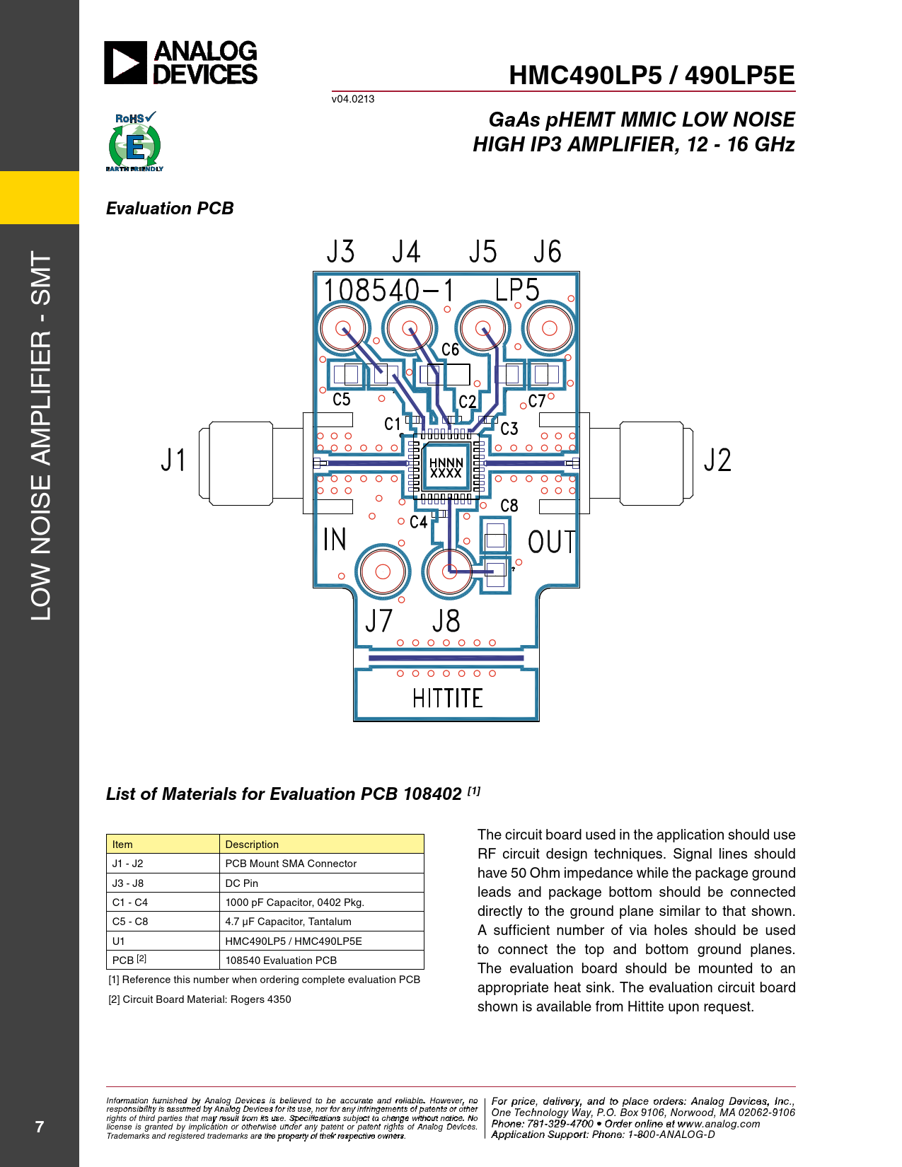 HMC490LP5 / 490LP5E. GaAs pHEMT MMIC LOW NOISE. HIGH IP3 AMPLIFIER, 12 - 16 GHz. Evaluation PCB