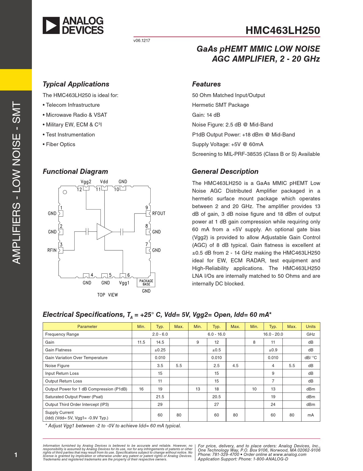 HMC463LH250. GaAs pHEMT MMIC LOW NOISE. AGC AMPLIFIER, 2 - 20 GHz. Typical Applications. Features. Functional Diagram