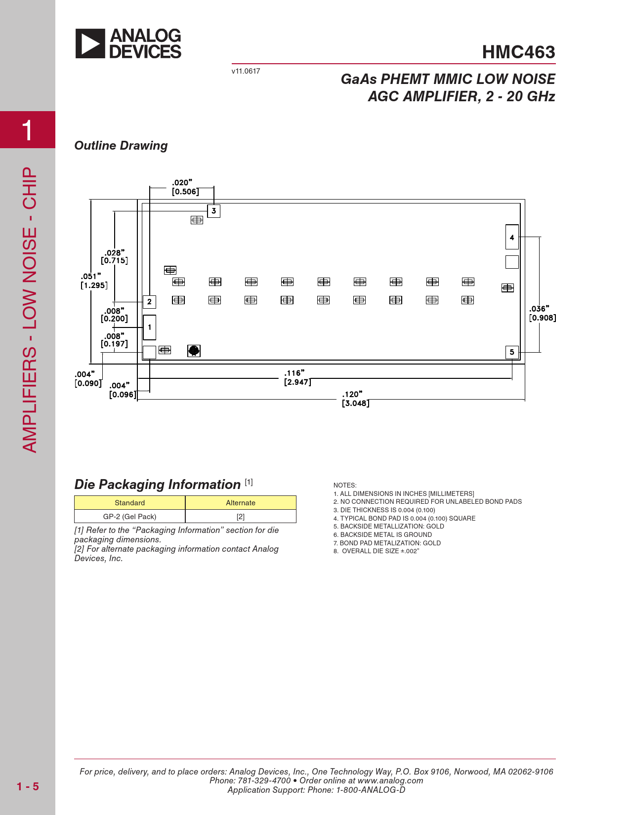 HMC463 v11.0617 GaAs PHEMT MMIC LOW NOISEAGC AMPLIFIER, 2 - 20 GHz 1 Outline Drawing IP H E - C IS O W N O S - L R IE LIF P M A Die Packaging Information [1] NOTES: 1. ALL DIMENSIONS IN INCHES [MILLIMETERS] Standard Alternate 2. NO CONNECTION REQUIRED FOR UNLABELED BOND PADS 3. DIE THICKNESS IS 0.004 (0.100) GP-2 (Gel Pack) [2] 4. TYPICAL BOND PAD IS 0.004 (0.100) SQUARE 5. BACKSIDE METALLIZATION: GOLD [1] Refer to the “Packaging Information” section for die 6. BACKSIDE METAL IS GROUND packaging dimensions. 7. BOND PAD METALIZATION: GOLD [2] For alternate packaging information contact Analog 8. OVERALL DIE SIZE ±.002” Devices, Inc. For price, delivery, and to place orders: Analog Devices, Inc., One Technology Way, P.O. Box 9106, Norwood, MA 02062-9106 1 - 5 Phone: 781-329-4700 • Order online at www.analog.com Application Support: Phone: 1-800-ANALOG-D